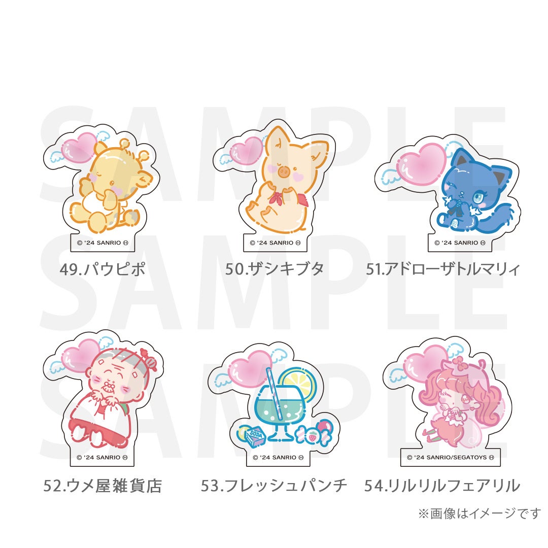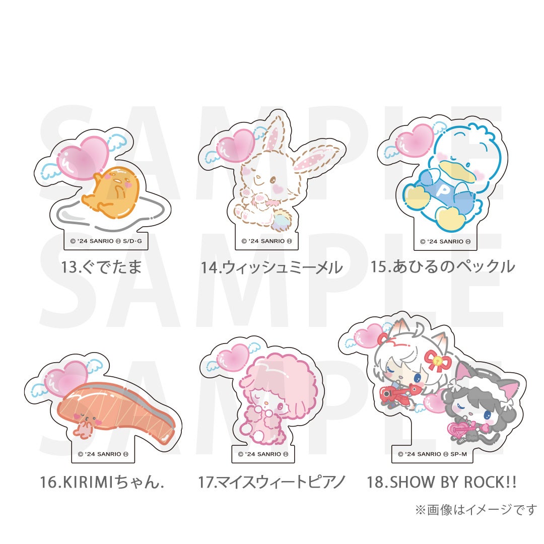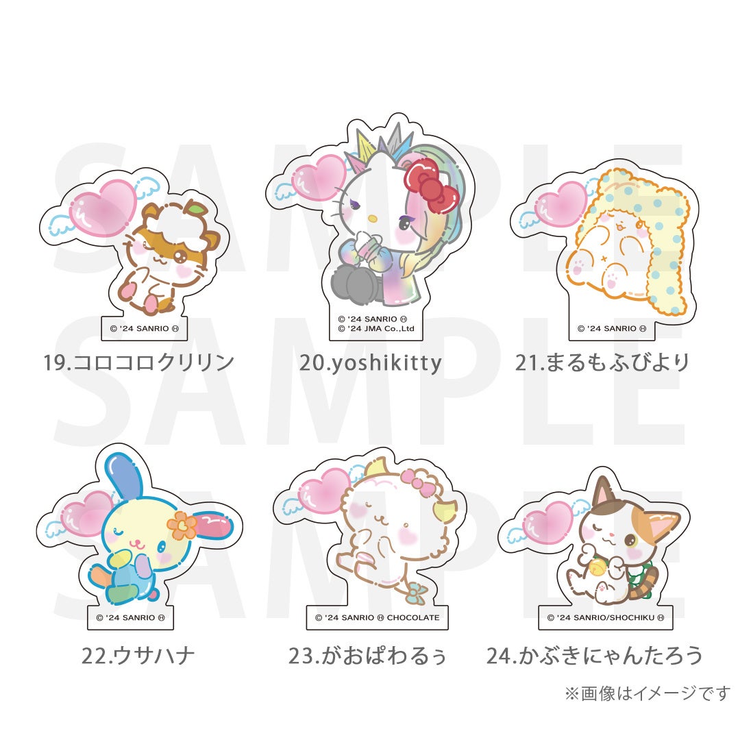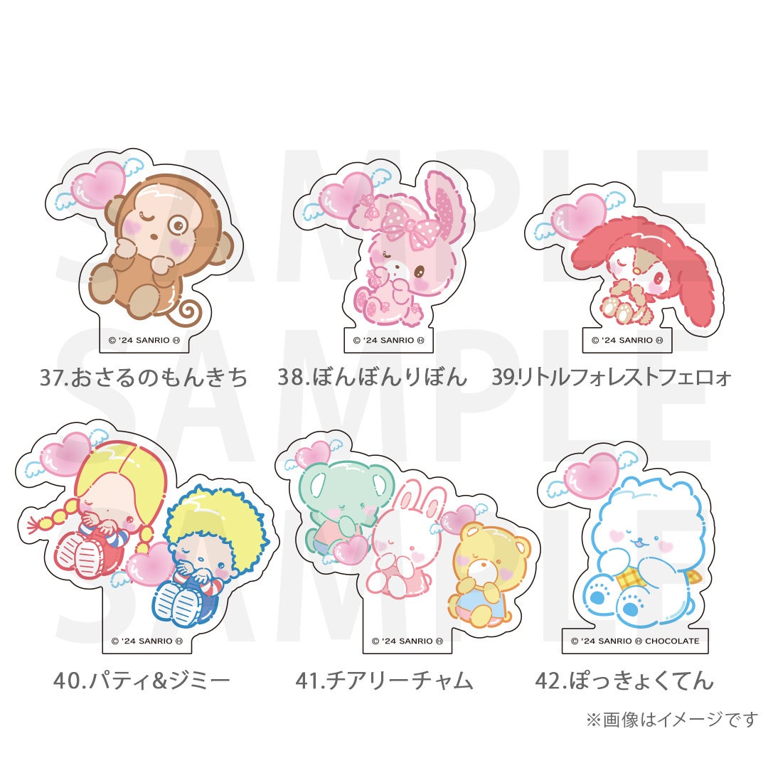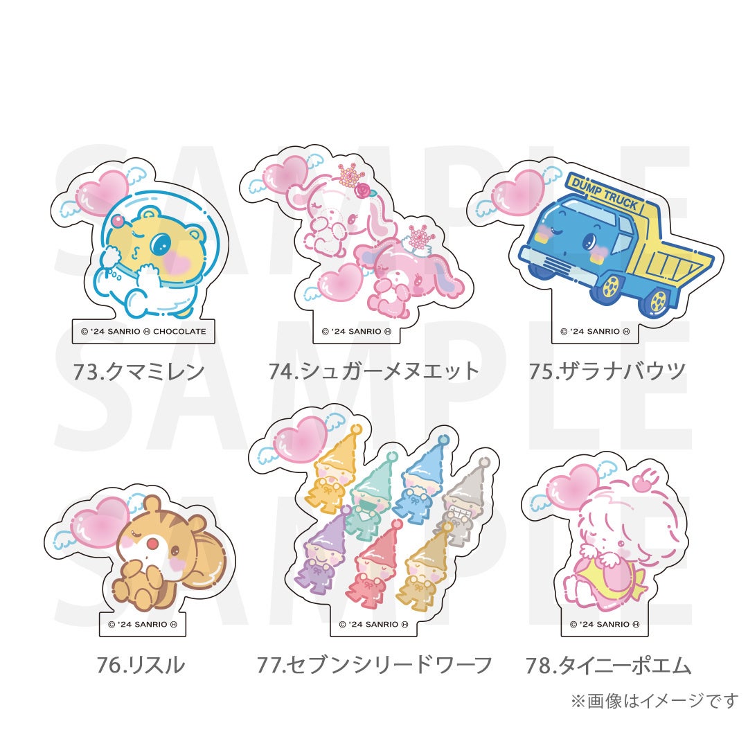 シナモロール、ポムポムプリン、クロミ、ポチャッコ、ハローキティ、マイメロディ、ハンギョドン、リトルツインスターズ、タキシードサム、バッドばつ丸、こぎみゅん、けろけろけろっぴ、ぐでたま、ウィッシュミーメル、あひるのペックル、KIRIMIちゃん.、マイスウィートピアノ、SHOW BY ROCK‼、コロコロクリリン、yoshikitty、まるもふびより、ウサハナ、がおぱわるぅ、かぶきにゃんたろう、マロンクリーム、みんなのたあ坊、ルロロマニック、ディアダニエル、チャーミーキティ、ハローミミィ、ジュエルペット、シュガーバニーズ、まいまいまいごえん、ニャニィニュニェニョン、ゴロピカドン、アグレッシブ烈子、おさるのもんきち、ぼんぼんりぼん、リトルフォレストフェロォ、パティ&ジミー、チアリーチャム、ぽっきょくてん、タイニーチャム、歯ぐるまんスタイル、ミュークルドリーミー、パタパタペッピー、ビートキャッツ、マシュマロみたいなふわふわにゃんこ、パウピポ、ザシキブタ、アドローザトルマリィ、ウメ屋雑貨店、フレッシュパンチ、リルリルフェアリル、チョコキャット、かしわんこもち、ぱんくんち、いちごの王さま、ノラネコランド、ハミングミント、イチゴマン、カリバディクス、ぽこぽん日記、ザ ボードビルディオ、くすりの福太郎、ぼさにまる、メローチューン、シンカイゾク、るるる学園、てのりくま、ウィンキーピンキー、プワワ、クマミレン、シュガーメヌエット、ザラナバウツ、リスル、セブンシリードワーフ、タイニーポエム、たらいぐまのらんどりー、ニョッキ&ペンネ、パンナピッタ、ボタンノーズ、スポーティングベアーズ、リトルラヴィン、バニー&マッティ、ミスターベアーズドリーム、ウィアーダイナソアーズ!、ぺたぺたみにりあん、BUDDYEDDY、はなまるおばけ