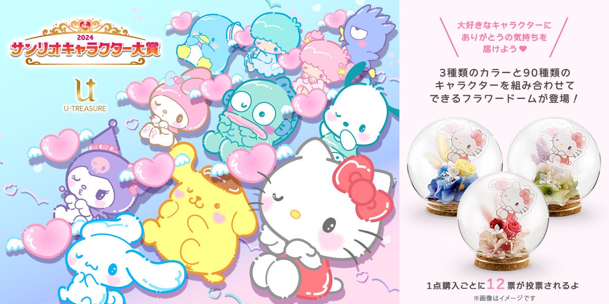 株式会社ユートレジャー(本社:東京都新宿区、代表取締役:伊藤 崇史)は、株式会社サンリオが開催する人気投票イベント「2024年サンリオキャラクター大賞」とのコラボレーションアイテム「フラワードーム」を2024年4月11日(木)~5月22日(水)の期間限定で予約受付を行います。