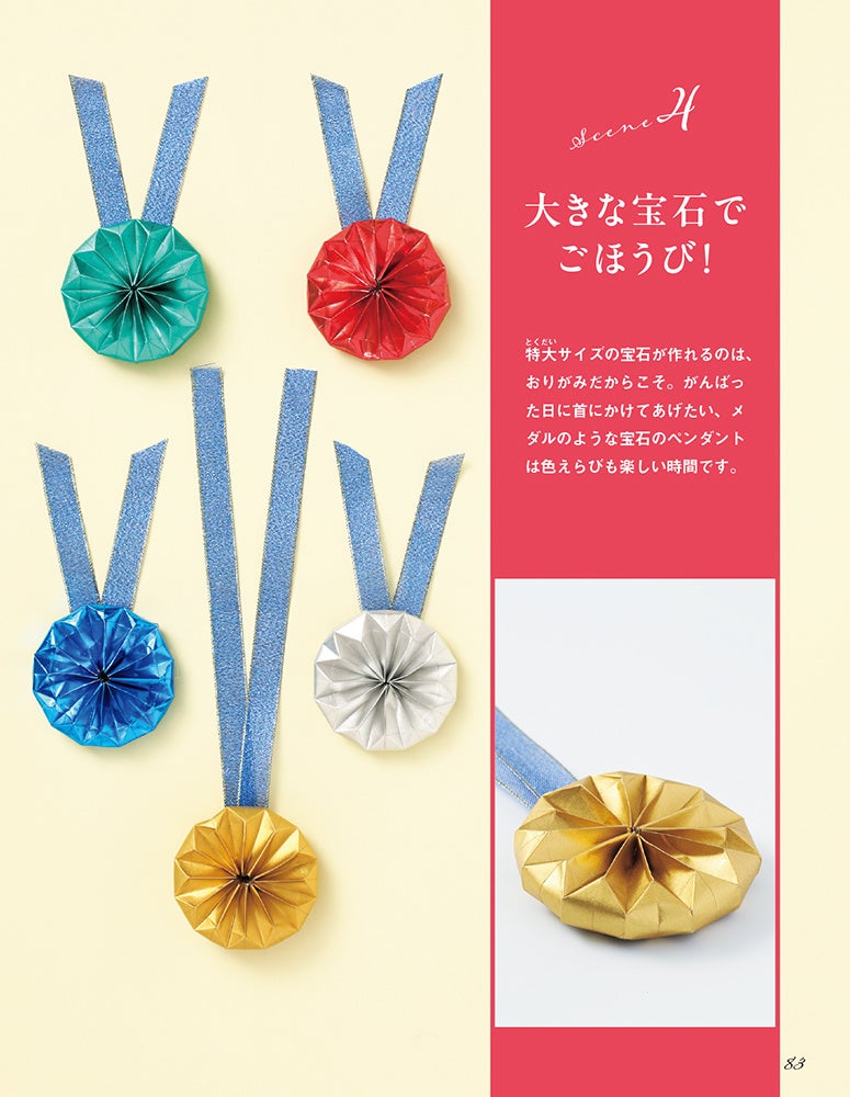 ダイヤモンドやルビー、サファイアのかがやきをおりがみで再現したら、指輪やネックレスにアレンジしましょう。メダルのような宝石ペンダントはまるでごほうび!人気アニメの重要アイテム「秘宝・銀水晶」や、特大サイズの宝石が作れるのは、おりがみだからこそ。