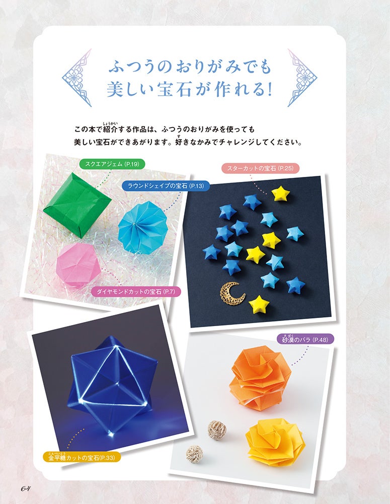 国内最大級の宝石情報メディア「カラッツmagazine」を運営する、KARATZを監修に迎え、実物の宝石写真と簡単な宝石の情報も紹介するミニ図鑑も掲載。宝石の美しさや特徴も学べる、あたらしいおりがみ本です。