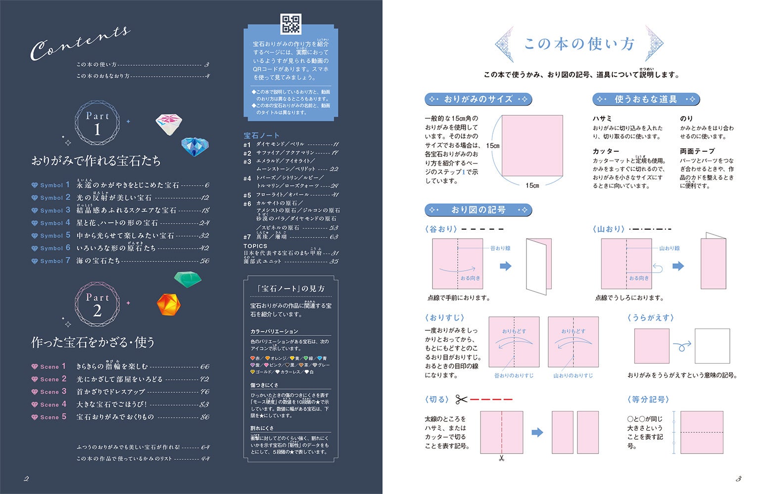 折紙制作は、東京大学折紙サークル・Oristの協力により、さまざまな素材の紙を使って、カンタンなものからちょっと難しいものまで、遊び心いっぱいの作品を多数収録。ふつうのおりがみでも美しい宝石が作れます!折り方に迷ったら、二次元コードからプロセス動画をチェック。実際に折っている手順を確認できます。