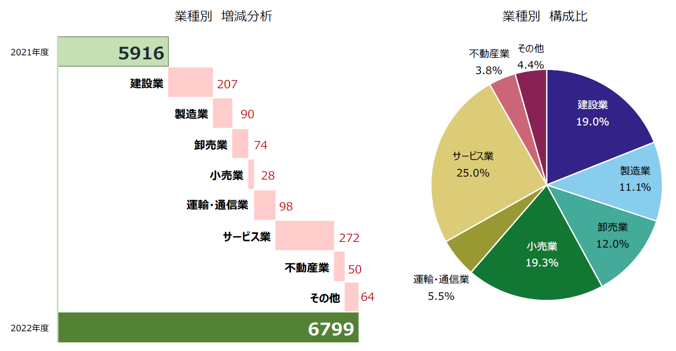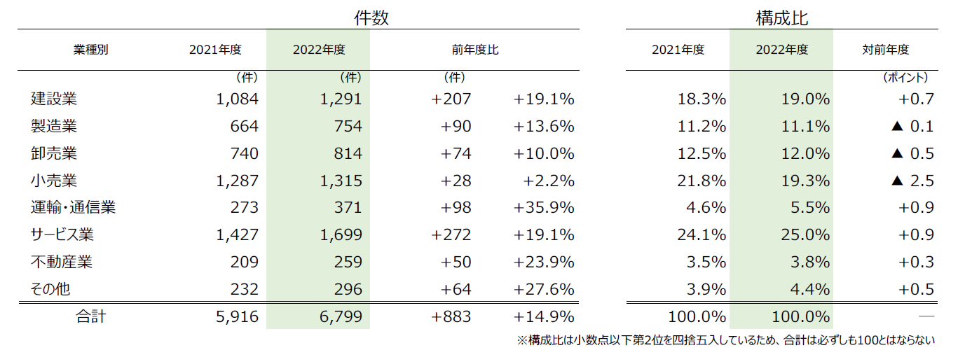 - 業種別にみると、14年ぶりに全業種で前年度を上回った。最多は『サービス業』(前年度1427件→1699件、19.1%増)で、『小売業』(同1287件→1315件、2.2%増)が続き、コロナ関連の倒産が目立った