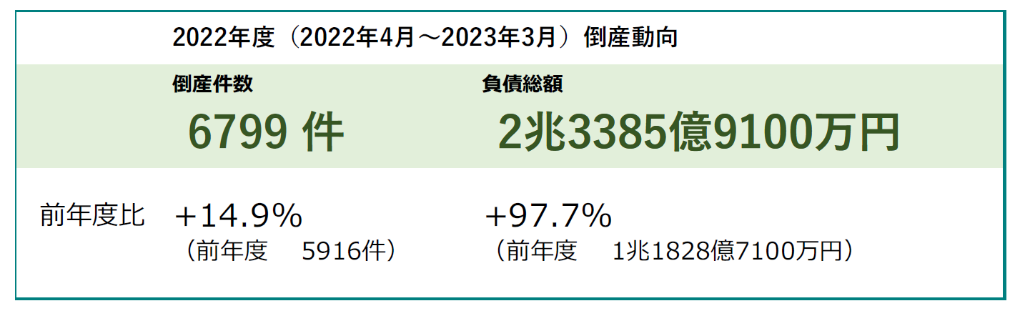 2022年度の倒産件数は6799件(前年度5916件、14.9%増)となり、2019年度以来3年ぶりに増加した。2022年5月から2023年3月まで11カ月連続で前年同月を上回り、前年度から800件以上の大幅増となったのは2008年度以来14年ぶり。