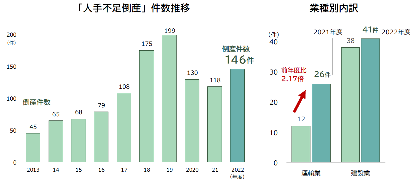 「人手不足倒産」は、2022年度において146件(前年度118件、23.7%増)発生した。コロナ禍前となる2019年度(199件)以来、3年ぶりに前年度を上回った。業種別では「建設業」(41件)「運輸業」(26件)で多く、特に「運輸業」は前年から2倍以上増加し、残り1年に迫った「2024年問題」を前に人手不足による悪影響が深刻化している。