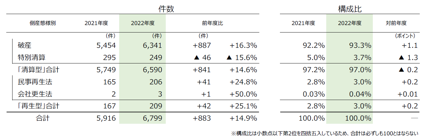 倒産態様別にみると、『清算型』倒産の合計は6590件(前年度5749件、14.6%増)となり、構成比は97.0%(対前年比0.2ポイント減)を占めた。『再生型』倒産は209件(同167件、25.1%増)発生し、『清算型』『再生型』ともに3年ぶりに前年度を上回った。