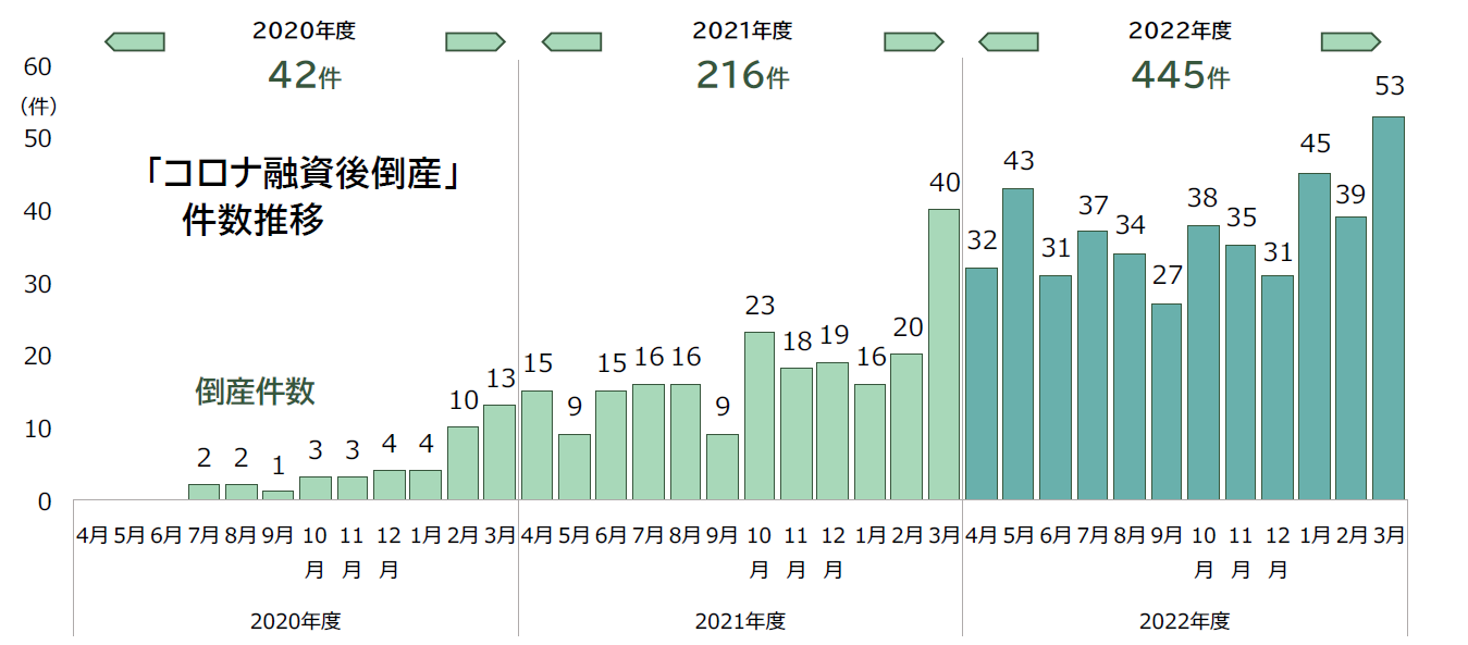 「コロナ融資後倒産」は、2022年度において445件(前年度216件、106.0%増)発生した。月次ベースで2023年3月が過去最多を更新するなど、前年度から倍増した。実際の融資額が判明した約220社のコロナ融資借入額平均は約5900万円だった。コロナ融資損失総額は推計413億1453万円にのぼり、国民一人当たり約330円の負担が既に発生している計算になる。