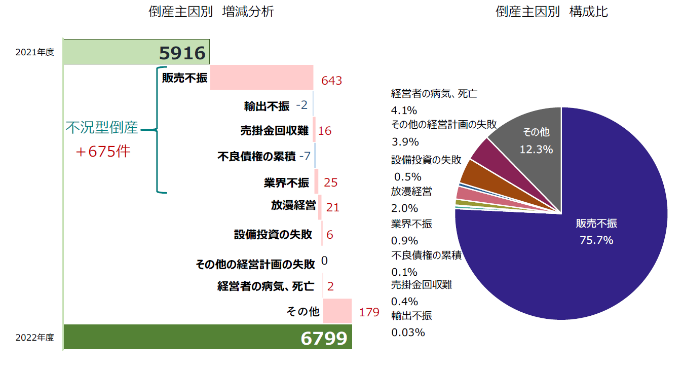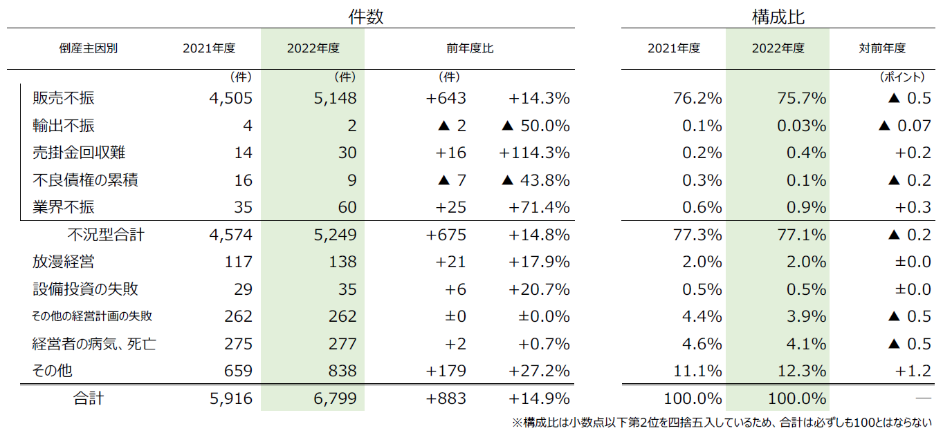 「販売不振」の5148件(前年度4505件、14.3%増)が最も多く、構成比は75.7%(対前年度0.5ポイント減)を占めた。「業界不振」(前年度35件→60件、71.4%増)は、2008年度以来の前年度比50%超を記録した。「経営者の病気、死亡」(同275件→277件、0.7%増)は、過去20年間で最も多かった2021年度を超え、過去最多を更新した。このほか、「売掛金回収難」(同14件→30件、114.3%増)は倍増した。