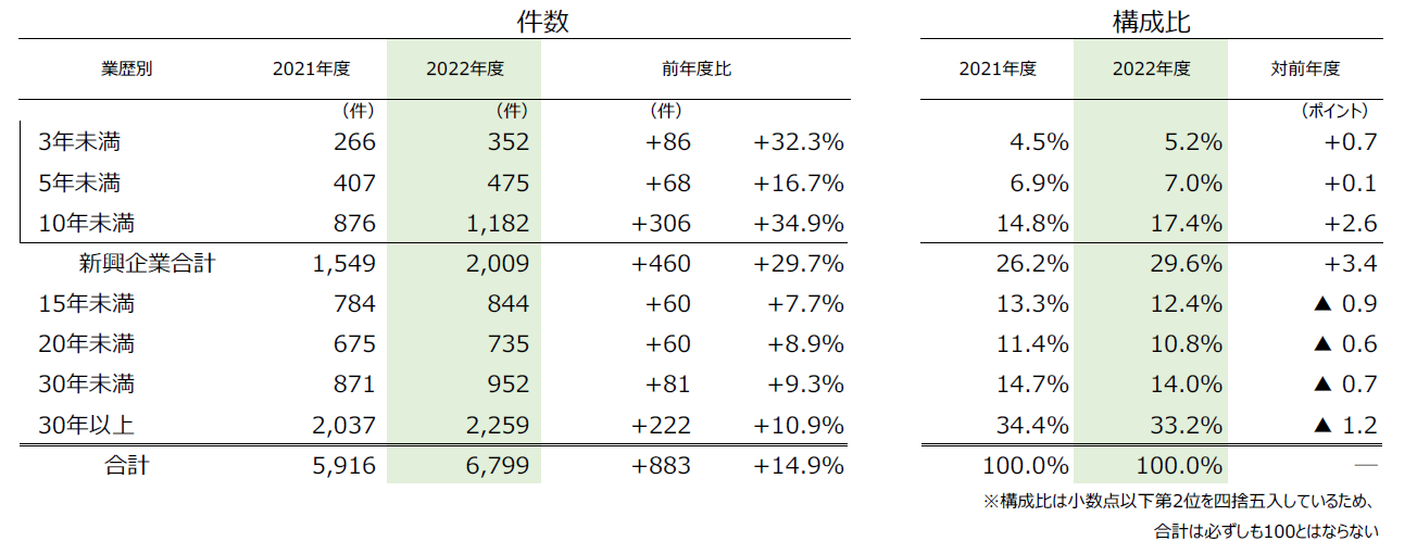 - 業歴別にみると、業歴10年未満の新興企業は14年ぶりに400件以上増加