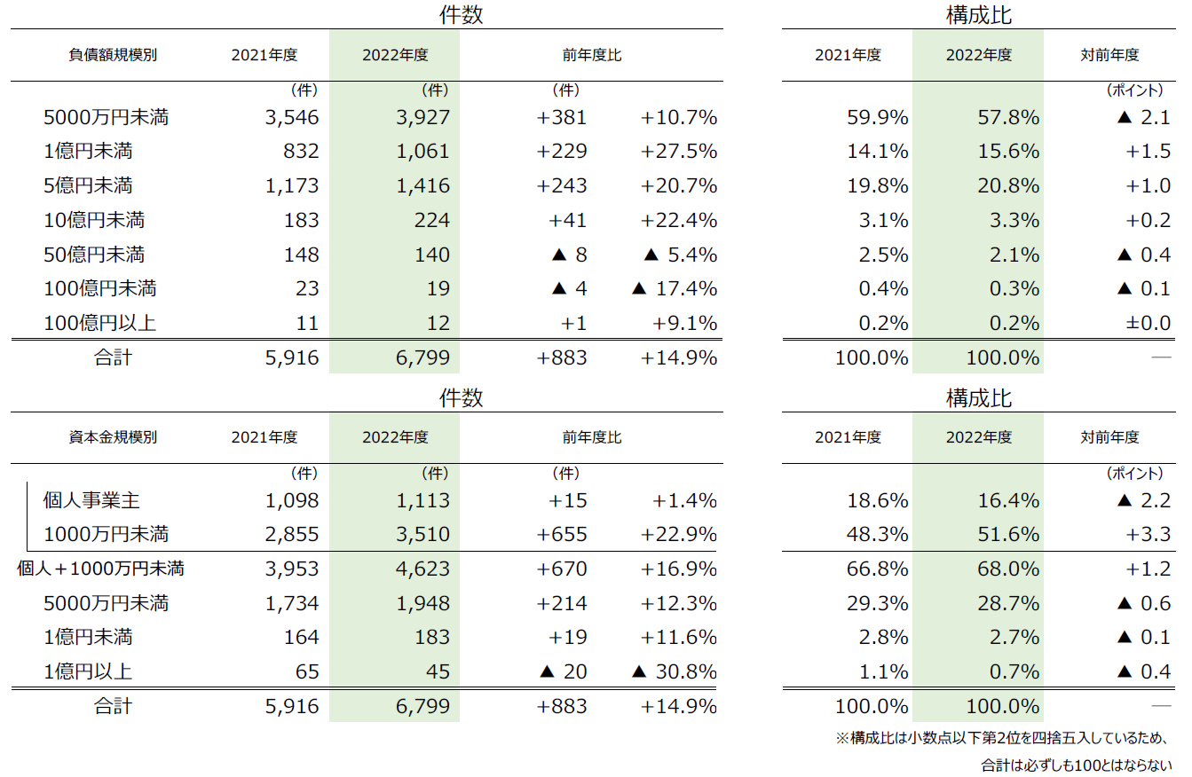 資本金規模別では、『1000万円未満(個人事業主含む)』の倒産は4623件(前年度3953件、16.9%増)発生し、全体の68.0%を占めた。