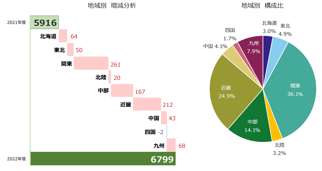 一方、唯一減少した『四国』(前年度116件→114件、1.7%減)は、前年度と比べて2件少なく、ほぼ横ばいに近かった。