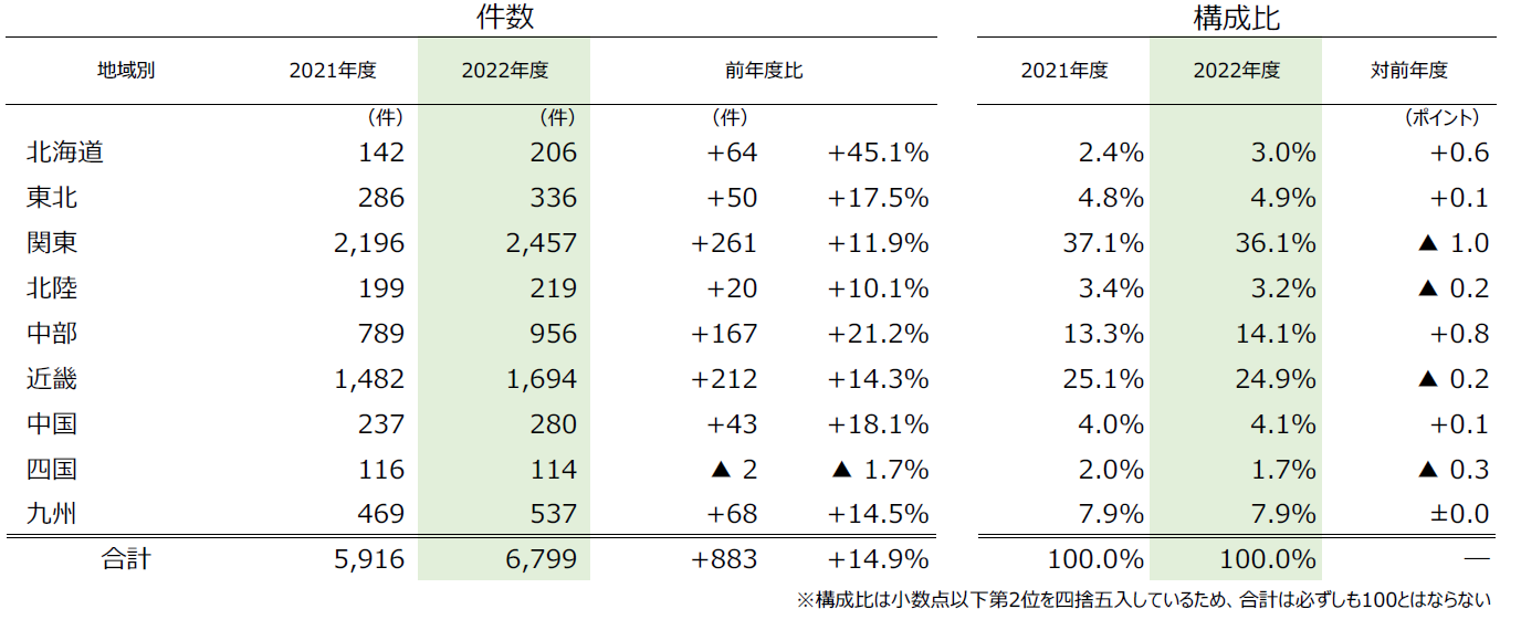 - 地域別にみると、『四国』除く全地域で前年度比増加。『北海道』(前年度142件→206件、45.1%増)は、全地域で唯一コロナ禍直前の2019年度(201件)を超えた。『中部』(同789件→956件、21.2%増)は食品関連産業で増加が目立った