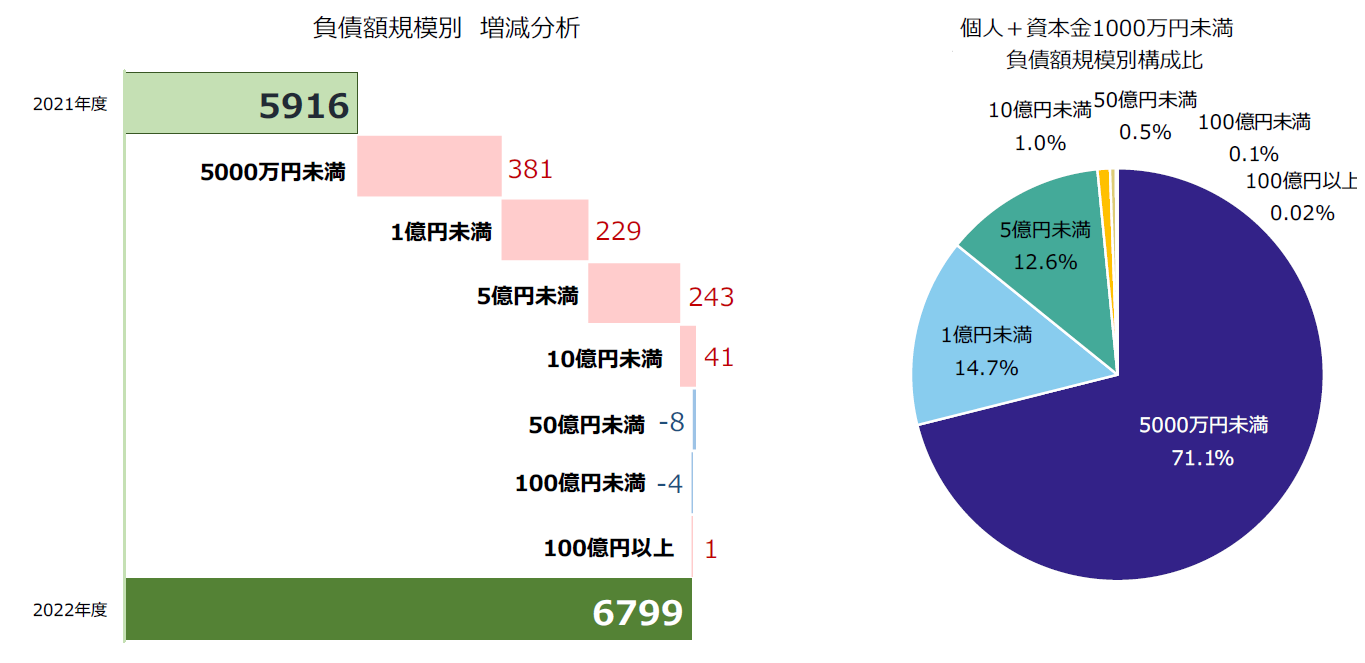負債規模別にみると、「5000万円未満」の倒産は3927件(前年度3546件、10.7%増)、構成比57.8%を占め最も多く、零細規模が目立った。次いで「5億円未満」が1416件(同1173件、20.7%増)、「1億円未満」が1061件(同832件、27.5%増)で続いた。