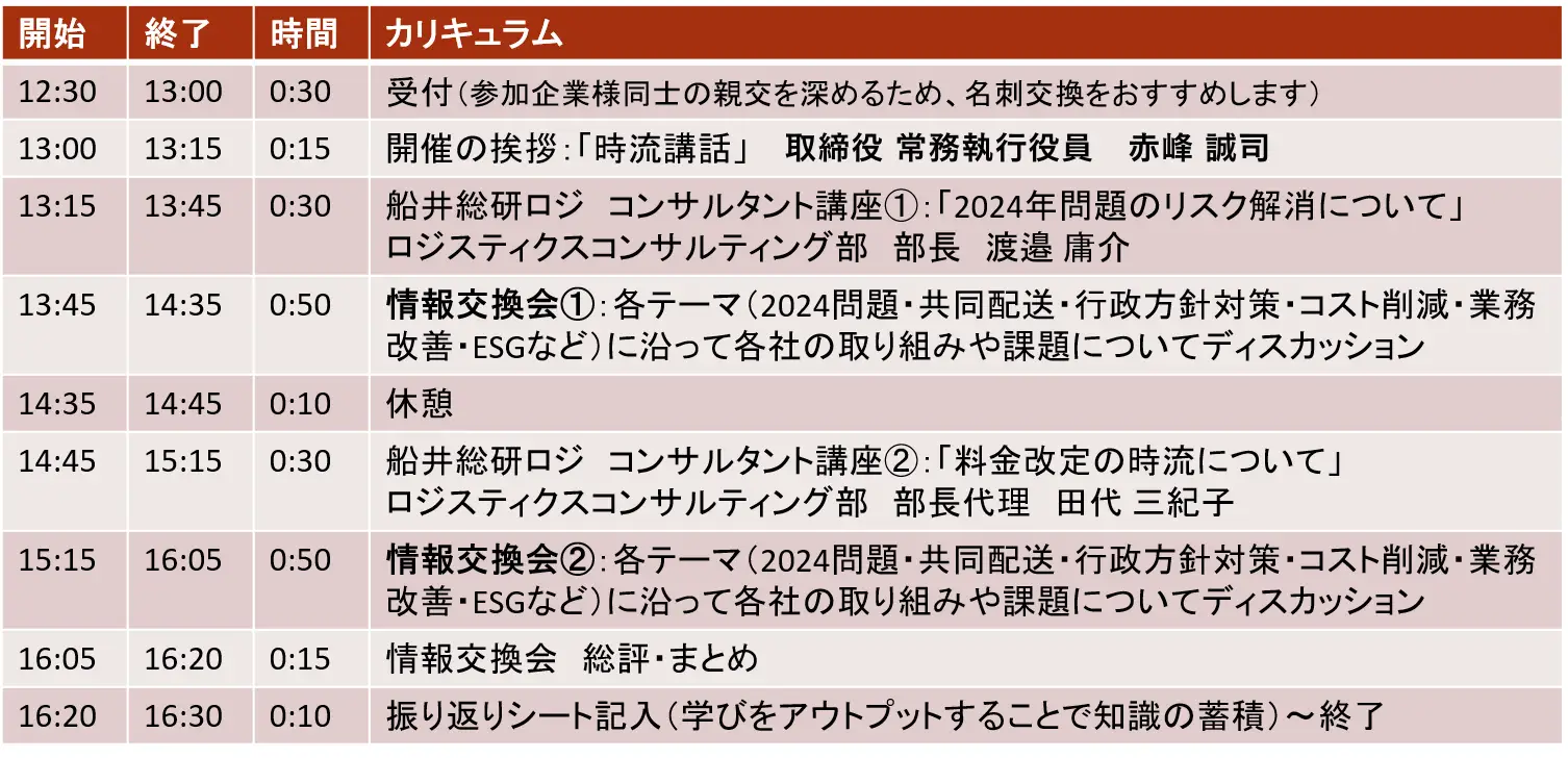2023年に開催したプレ情報交流会では、全国から物流責任者・担当者が集まり、船井総研ロジ コンサルタント講座や、参加企業による情報交換会(テーマ2024年リスク対策、行政指導、共同配送、モーダルシフトなど)を実施しました。