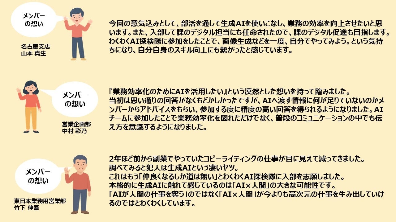 「わくわくAI探検隊」は、業務効率化や生産性の向上を目標として、営業本部の社員を対象とした、生成AIを”楽しく”学ぶ社内コミュニティです。