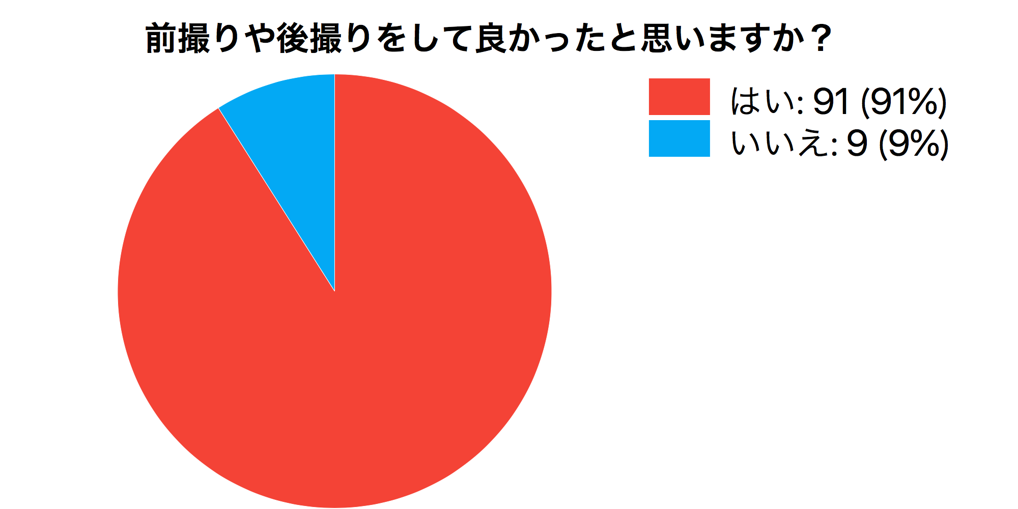 「Q4.前撮りや後撮りをして良かったと思いますか?」と質問したところ、「はい」が91%、「いいえ」が9%という結果になりました。