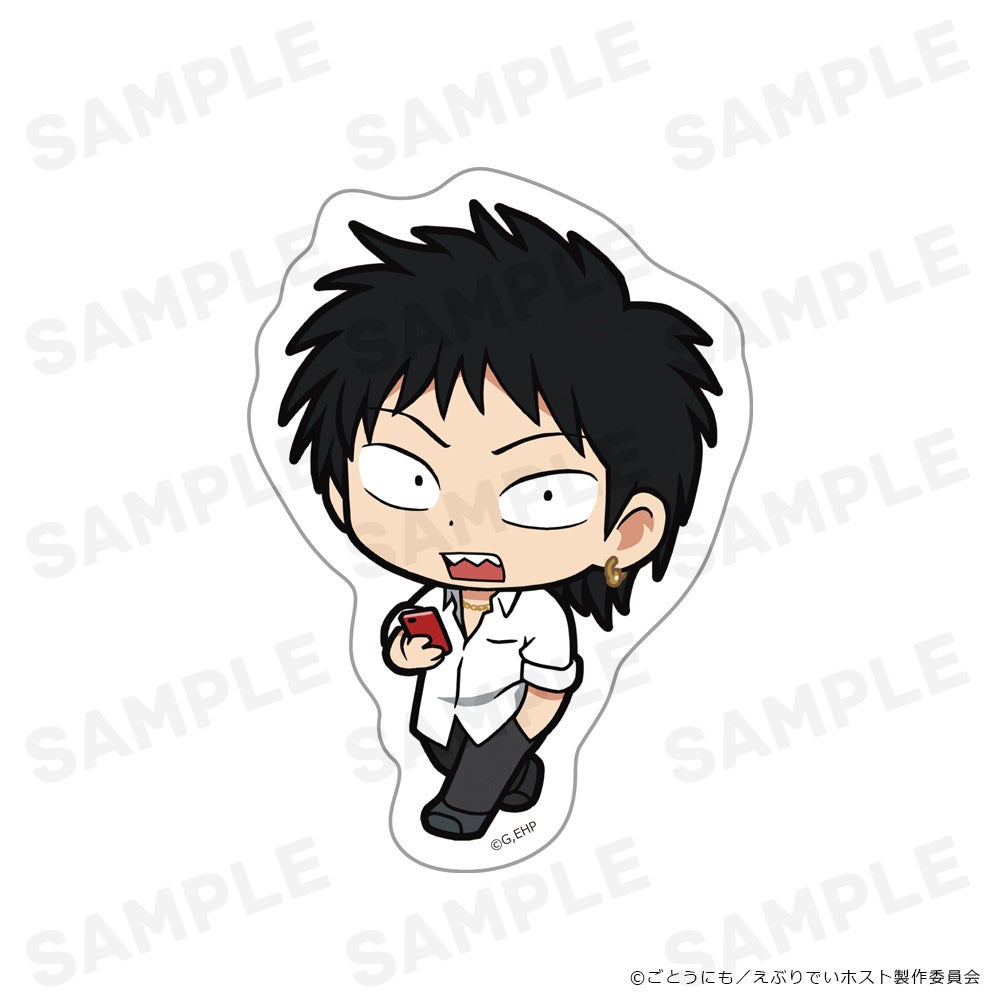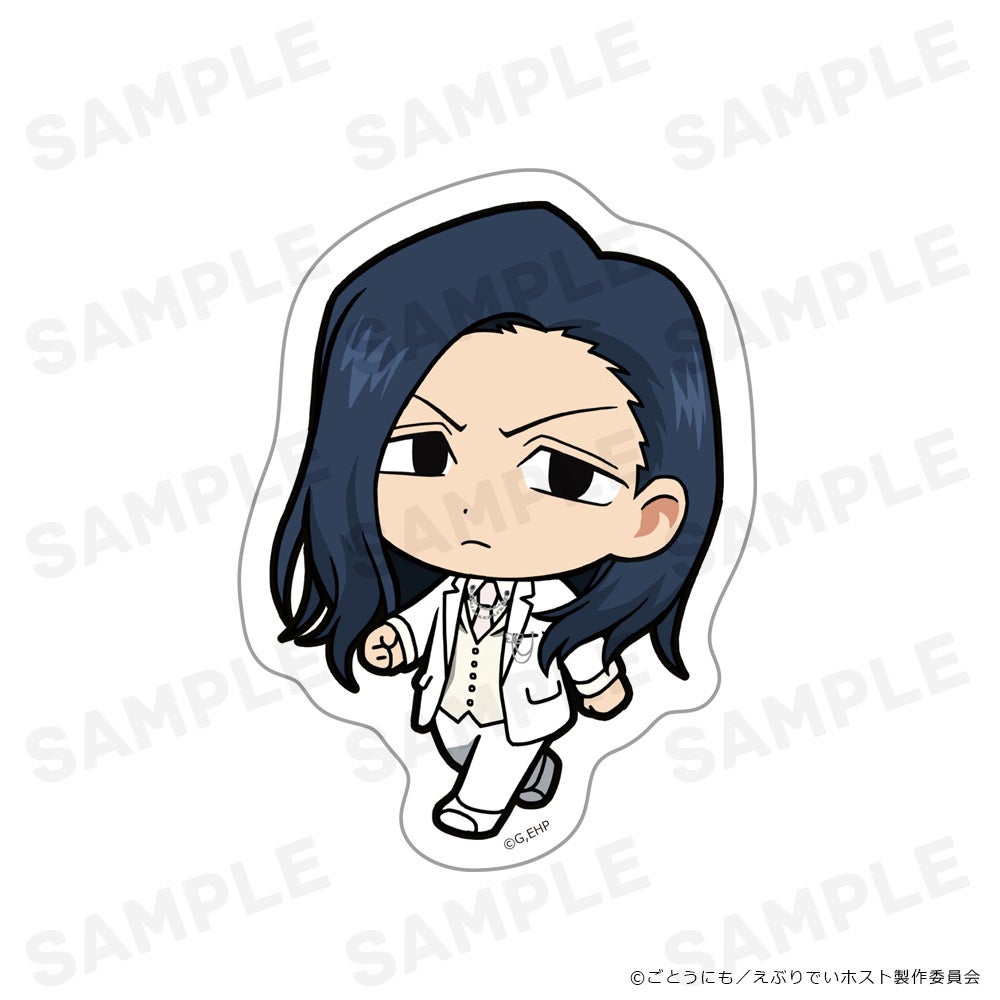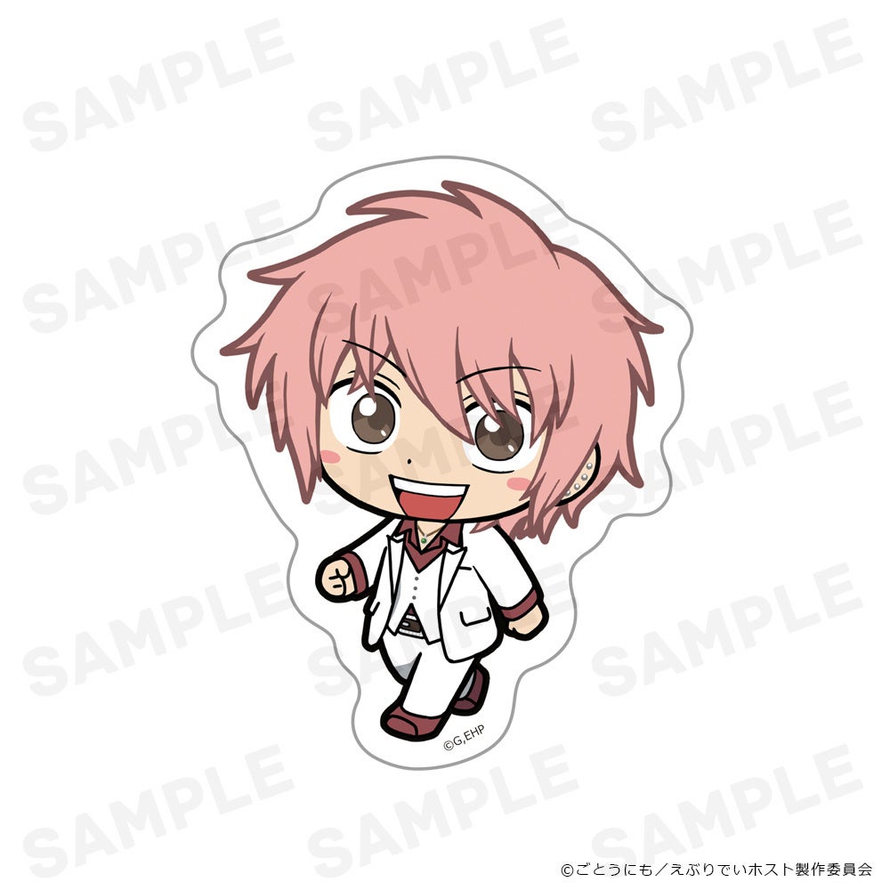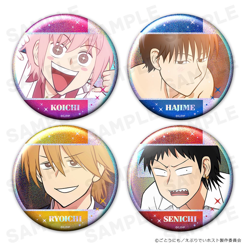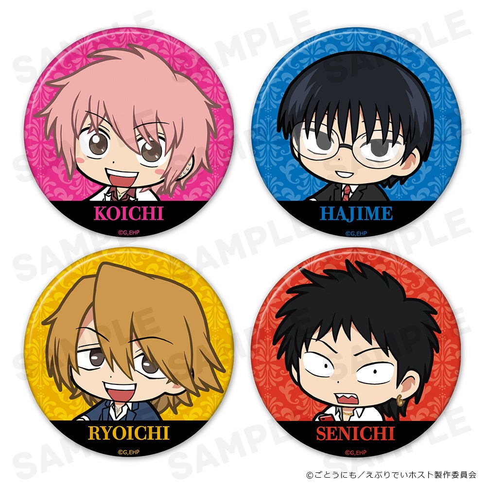 アニメ「えぶりでいホスト」ホログラム缶バッジ4個セット、ついてっく缶バッジ4個セット、ついてっく厚みアクリルスタンド、ついてっくダイカットステッカーの受注を開始しました!