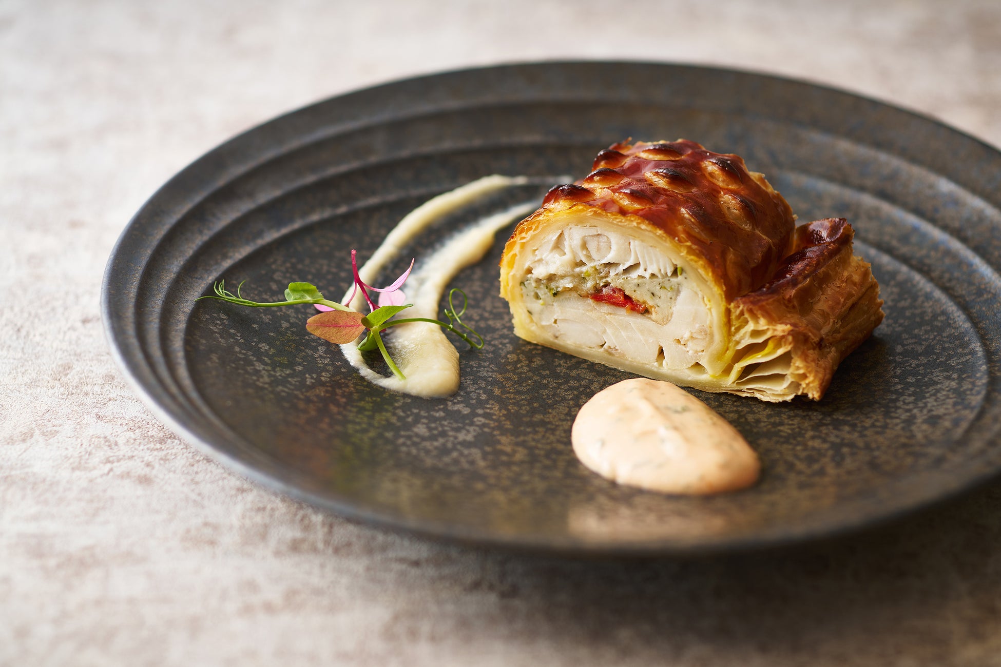 京都産のスズキを、湯葉とパイで包み、香ばしく焼き上げた一品。ソースはフランス料理の王道ソースショロンを添えて。