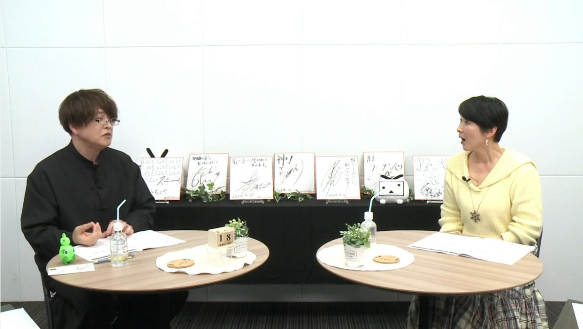 エンディングトークでは、今日の感想を色紙に書き発表。久川が今後の活動について健康で仕事を続けるための心がけを話し、それを聞いた緑川が「めっちゃ良いこと言うなぁ。刺さる、泣きそうになるな」と言うと「泣いてねーじゃん!(笑)」(久川)と一蹴。40年来の付き合いの2人の仲の良さが伝わり、終始笑い声の絶えない回となりました。