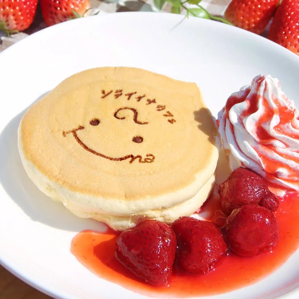 ふわふわの米粉パンケーキです。クリスマスカラーのいちごのパンケーキや、期間限定のリッチなピスタチオクリームのパンケーキもご用意しています。メレンゲを加えてふっくらと米油で焼いたグルテンフリーのパンケーキ、ぜひお召し上がりください。