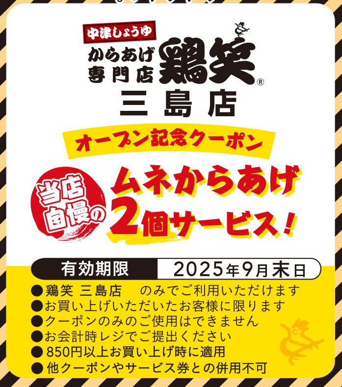 鶏笑 三島店のオープンを記念して、 三島店限定で「ムネからあげ2 個」がもらえるクーポン券を、数量限定で店頭などでお配りしています。以下のクーポン画像をスマートフォン等でご提示いただいても有効です。