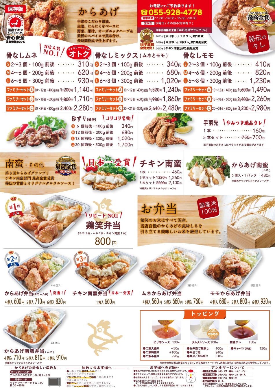 この度オープンいたします「鶏笑 三島店」は、伊豆箱根鉄道駿豆線(すんずせん)三島田町駅から徒歩1分のところにあります。ご注文はお電話から事前にご連絡いただければ、お待たせすることなく商品をお渡しできます。昼食のお弁当、晩御飯のおかずやお酒のおつまみなど、毎日のお食事の中で、最高金賞受賞のからあげのおいしさをお楽しみください。