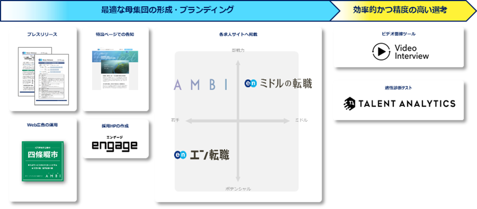 プレスリリースや特設ページ、採用HPの作成、Web広告での告知に加え、各求人サイトでの集客サポートを実施いたします。『エン転職』『AMBI』『ミドルの転職』とターゲットの異なる3つの求人サイトを活用することで、ターゲットへ網羅的に求人を届けます。ビデオ面接ツール『Video Interview』、適性診断テスト『Talent Analytics』も提供。選考フローの支援を通じて、求職者と同市の最良なマッチングを実施します。