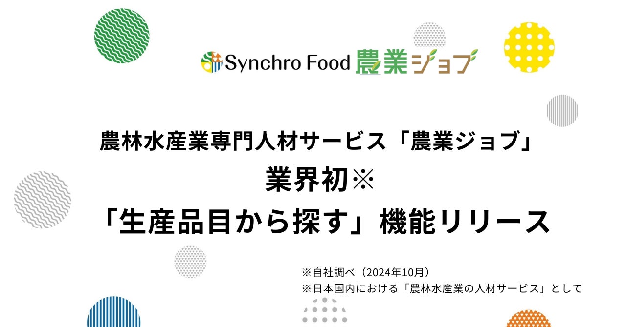 農林水産業専門の人材サービス「農業ジョブ」を運営する株式会社シンクロ・フード(本社:東京都渋谷区、代表取締役:藤代真一、東証プライム市場:3963)は、農業ジョブの求人検索方法の一つとして、業界初(※1)の「生産品目から探す」機能をリリースいたしました。