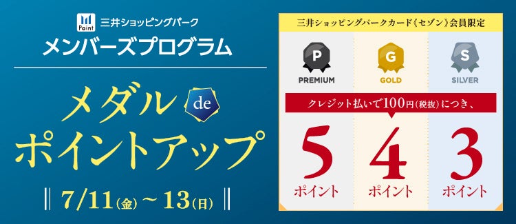 また、7月11日(金)~7月13日(日)の期間、三井ショッピングパークカード《セゾン》会員限定のメダルdeポイントアップを実施いたします。2025年度プレミアムメダル・ゴールドメダル・シルバーメダルの会員様に限り、クレジット機能付きポイントカード(アプリde支払い用QR含む)のクレジット払いでポイントアップいたします。お得なこの機会に、ラゾーナ川崎プラザでお買物をお楽しみください。