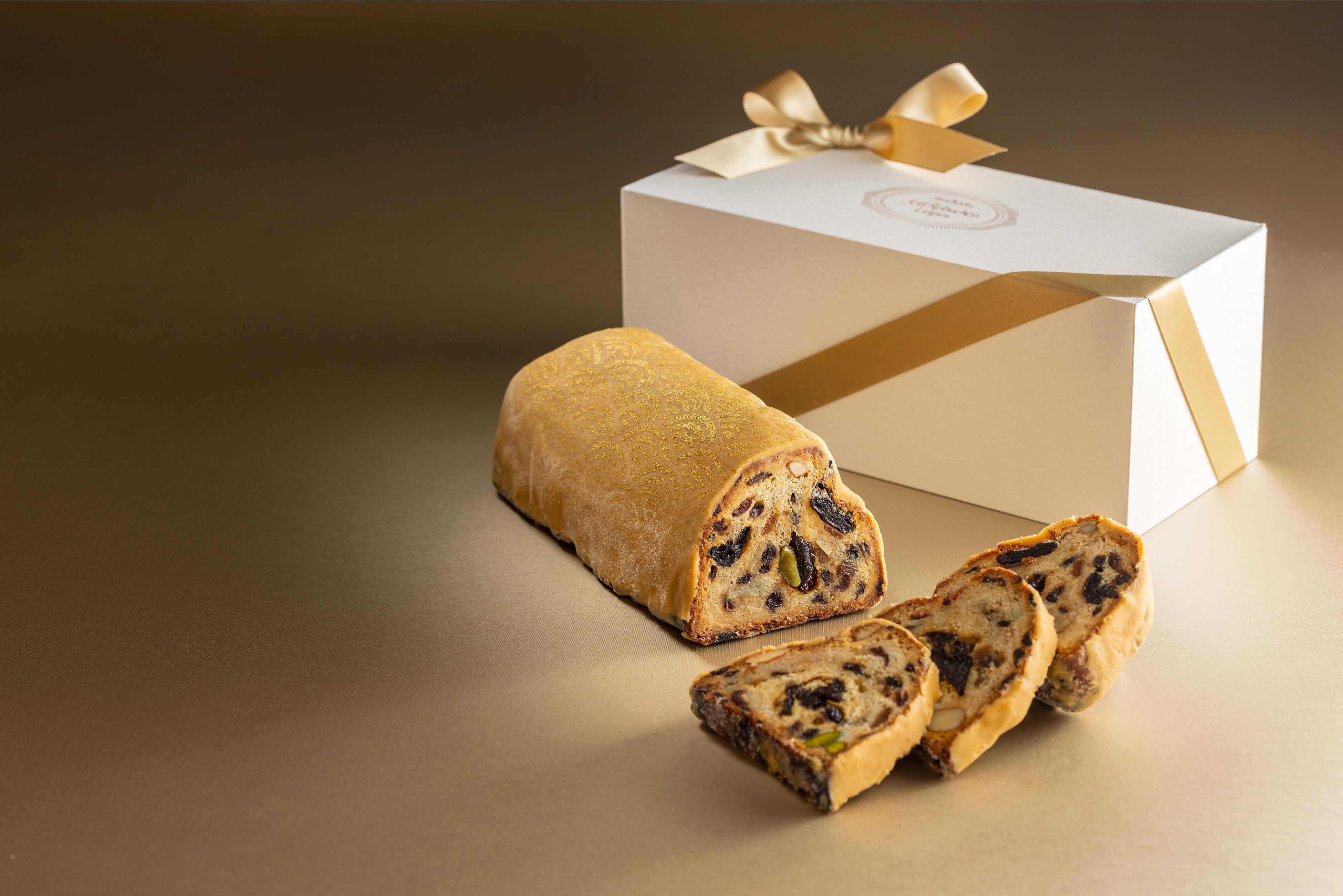 伝統的なクリスマスの発酵菓子です。ラム酒やキルシュなどの洋酒にじっくりと漬け込んだ7種類のドライフルーツとナッツをたっぷり練りこみ、コクのある深い味わいのシュトーレンです。上品な甘みと口どけのよい和三盆で仕上げています。日々熟成するので、食べるたびに深まる味わいをお楽しみ頂けます。