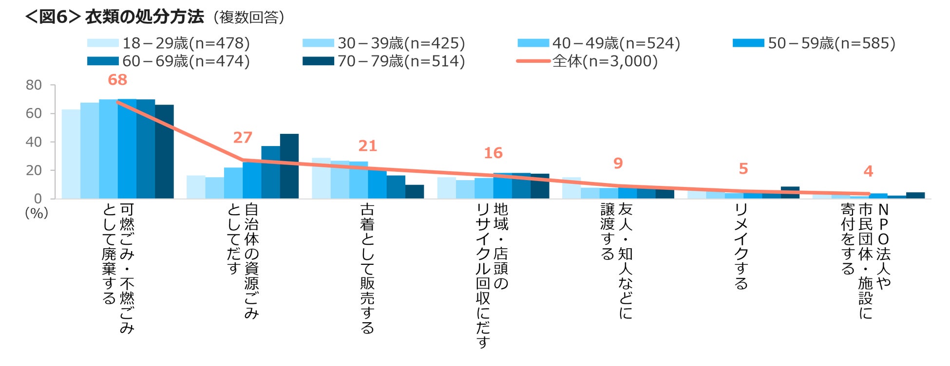 衣類を処分する際は、「可燃ごみ・不燃ごみとして廃棄」が68%と断トツ。次いで「自治体の資源ごみとしてだす」27%、 「古着として販売する」 21%。「自治体の資源ごみとしてだす」 は年代が高いほど、「古着として販売する」は年代が若いほど高くなる傾向がみられる。環境負荷を考慮したサステナブルなファッションへの取り組みのひとつである廃棄の削減は、現状とは乖離のある結果となった。<図6>