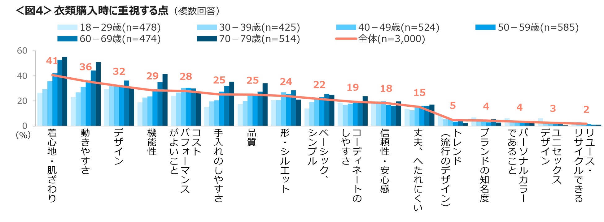 「着心地・肌ざわり」「動きやすさ」「デザイン」「機能性」「コストパフォーマンスがよい」がTOP5。デザインやコスパは年代差が少ない。<図4>