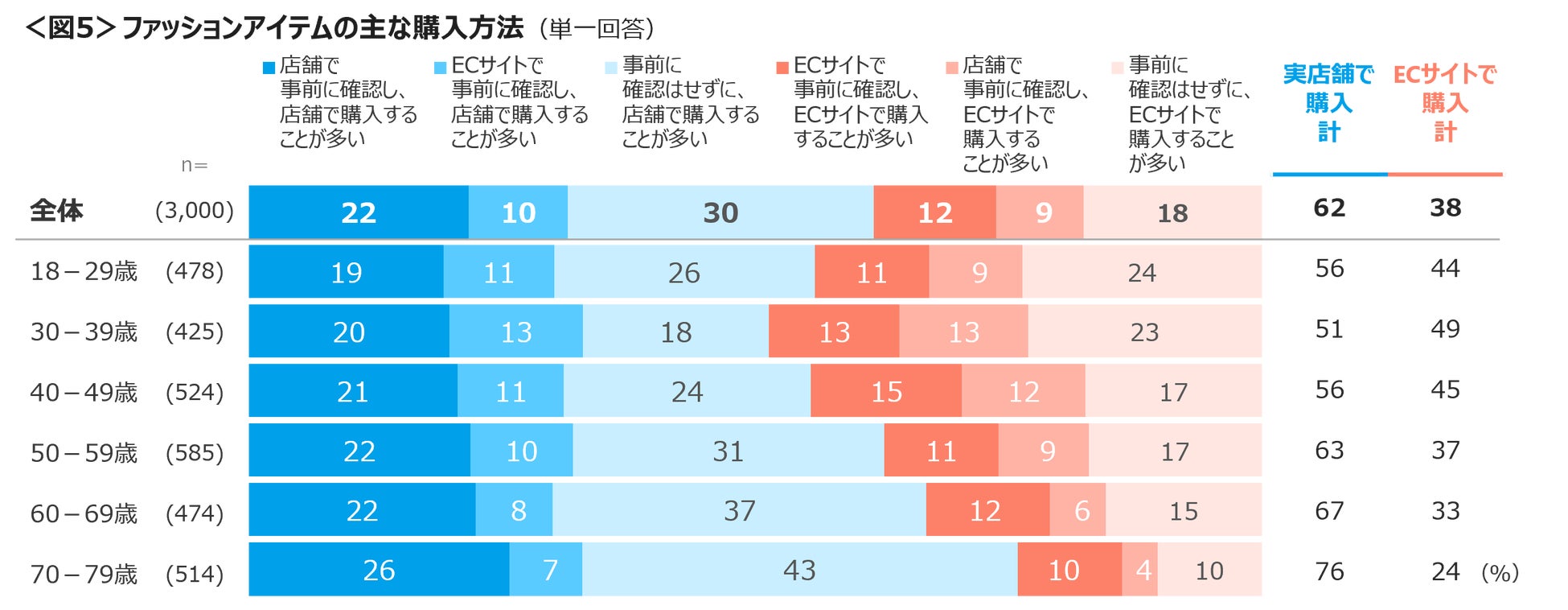 ファッションアイテムの主な購入方法は、「事前に確認はせずに、店舗で購入」30%、「店舗で事前に確認し、店舗で購入」22%、「事前に確認はせずに、ECサイトで購入」18%であり、購入先が実店舗は62%、ECサイトは38%である。18~29歳、30代は、「事前に確認はせずに、ECサイトで購入」が20%台と多い。18~29歳、30~40代までは、ECサイト購入が40%台を占める。<図5>