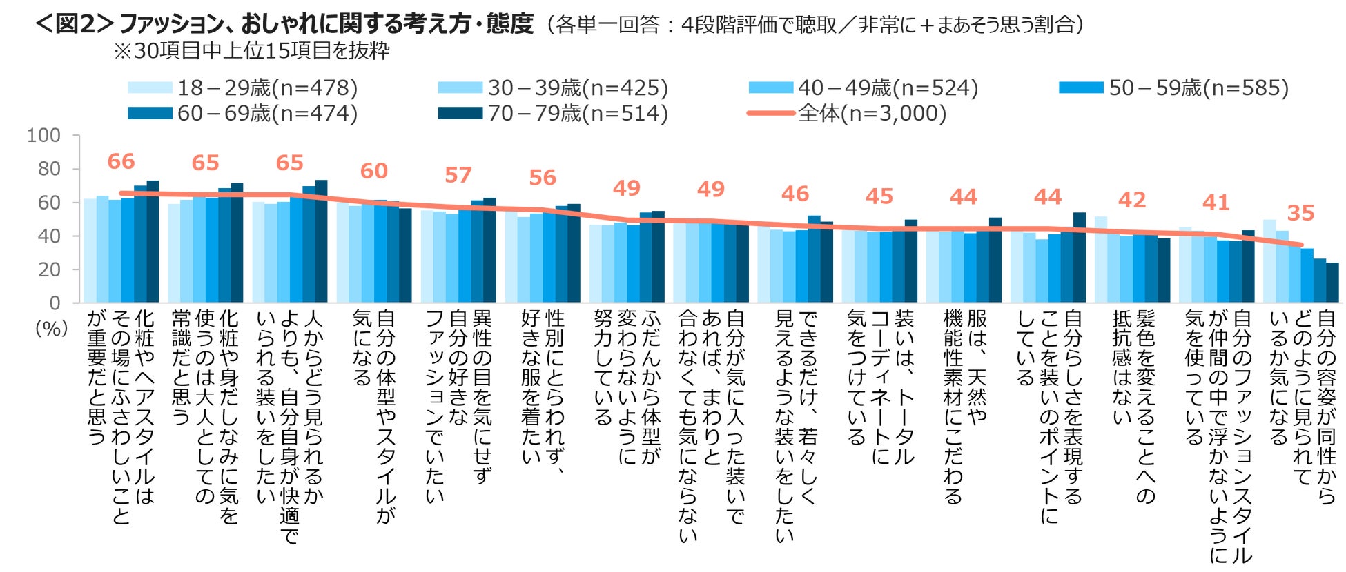 ファッション・おしゃれについての考え方・態度を4段階で聴取した。非常に+まあそう思う割合は、「化粧やヘアスタイルはその場にふさわしいことが重要」「化粧や身だしなみに気を使うのは大人としての常識」「人からどう見られているかよりも、自分自身が快適でいられる装いをしたい」がTOP3であり、年代が上がるほど高まる傾向にあった。次いで「自分の体型やスタイルが気になる」があがった。 気になる割合は年齢による差はなかった。<図2>