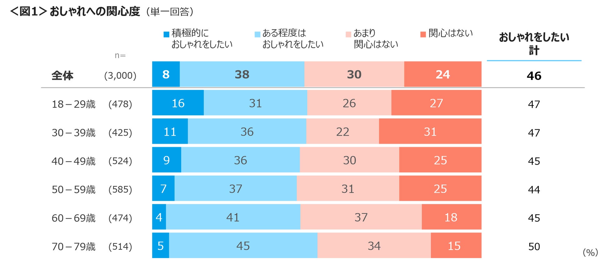 「積極的におしゃれをしたい」が8%、「ある程度はおしゃれをしたい」は38%、合わせて46%はおしゃれに関心がある。「積極的におしゃれをしたい」割合は、若年層ほど高まる。一方、「関心はない」は、30代が31%、18~29歳、40~50代は20%台と関心度はやや2極化の傾向がみえる。<図1>