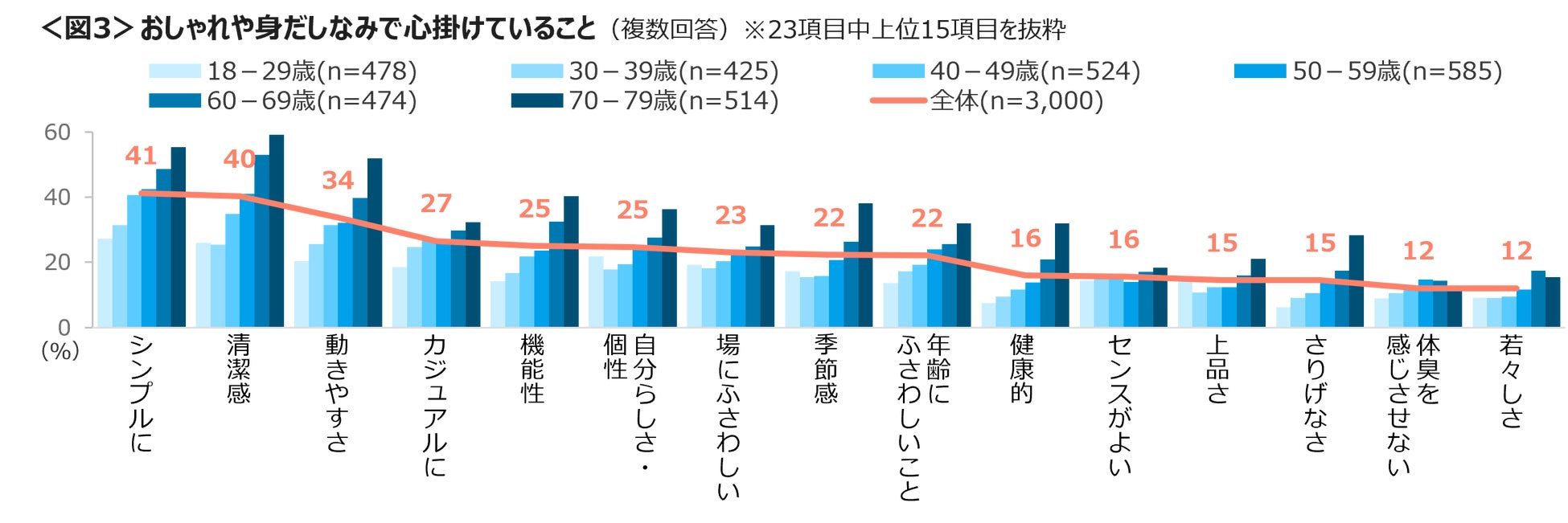 おしゃれや身だしなみで心掛けていることは、「シンプル」「清潔感」が4割台、「動きやすさ」が3割台、いずれも60~70代の高さが目立った。<図3>