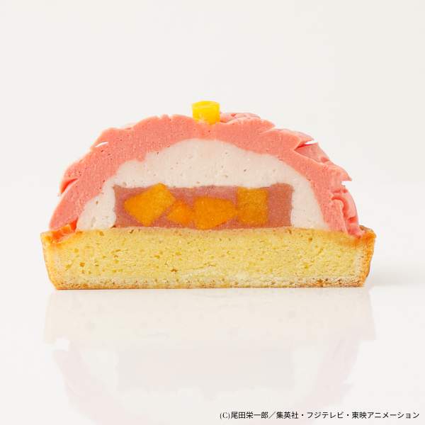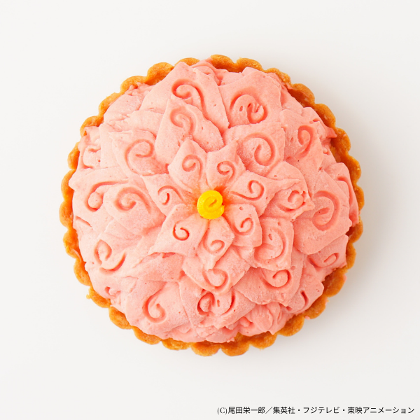 通称“悪魔の子”ニコ・ロビンが口にした「ハナハナの実」を再現し、ピンク色に仕上げたスイーツ。エシレバターを使用してしっとり焼き上げたタルト台の上には、なめらかな桃のムース。