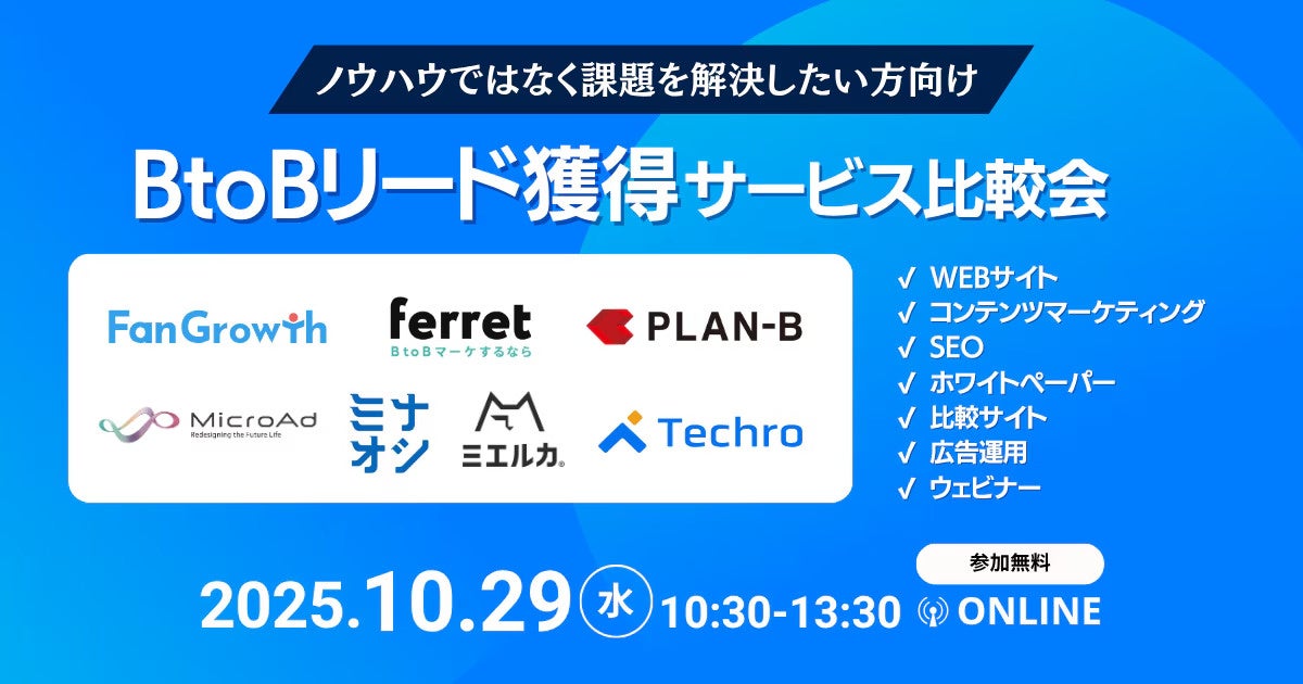 BtoBマーケティングのお困りごとをまるっと解決するサービス『ferret(フェレット)』を運営する株式会社ベーシック(本社:東京都千代田区、代表取締役:秋山勝)は、10/29(水)に開催されるエキサイト株式会社(本社:東京都港区、代表取締役社長:西條晋一)が主催するセミナー「成功事例から施策活用シーンがわかる!BtoBリード獲得サービス比較会」に登壇いたします。
