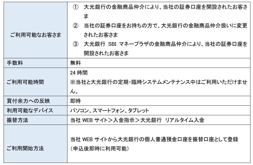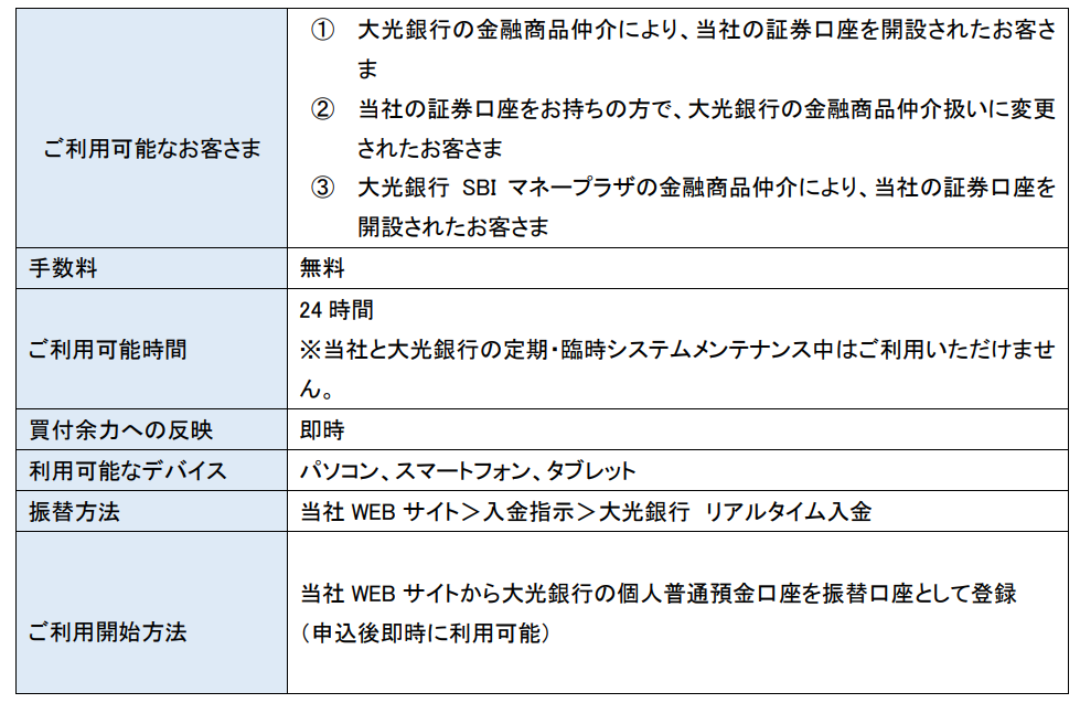 当社は、2021年5月13日(木)に、大光銀行と金融商品仲介業に関して提携し、金融商品・サービスの提供を開始しました。このたび提供開始する「大光銀行 リアルタイム入金」は、大光銀行の個人普通預金口座をお持ちで、大光銀行の金融商品仲介のお客さまが、当社WEBサイトより振替口座のご登録後、振込指示を行うことで、即時に手数料無料で当社証券総合口座に買付余力として反映できるサービスです。振替口座登録から振込指示まで、当社WEBサイト内にて完結します。