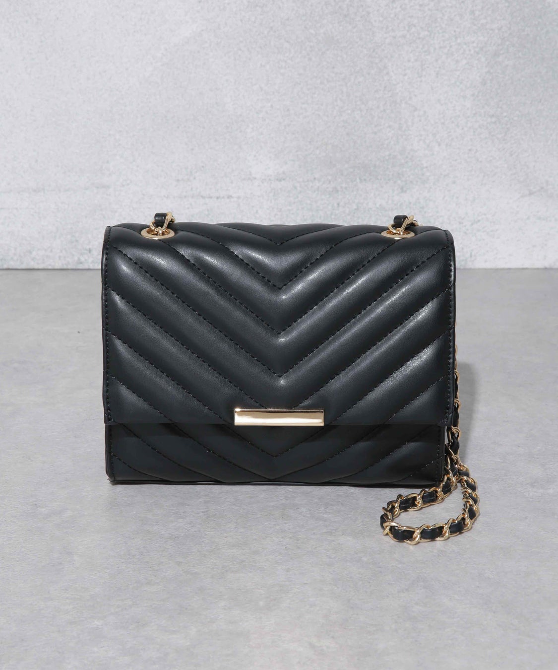 クラシカルな印象のスクエア型ショルダーバッグ。大人っぽい雰囲気に仕上がるV字のキルティングに、ゴールドのチェーンが女性らしい華やぎを演出。