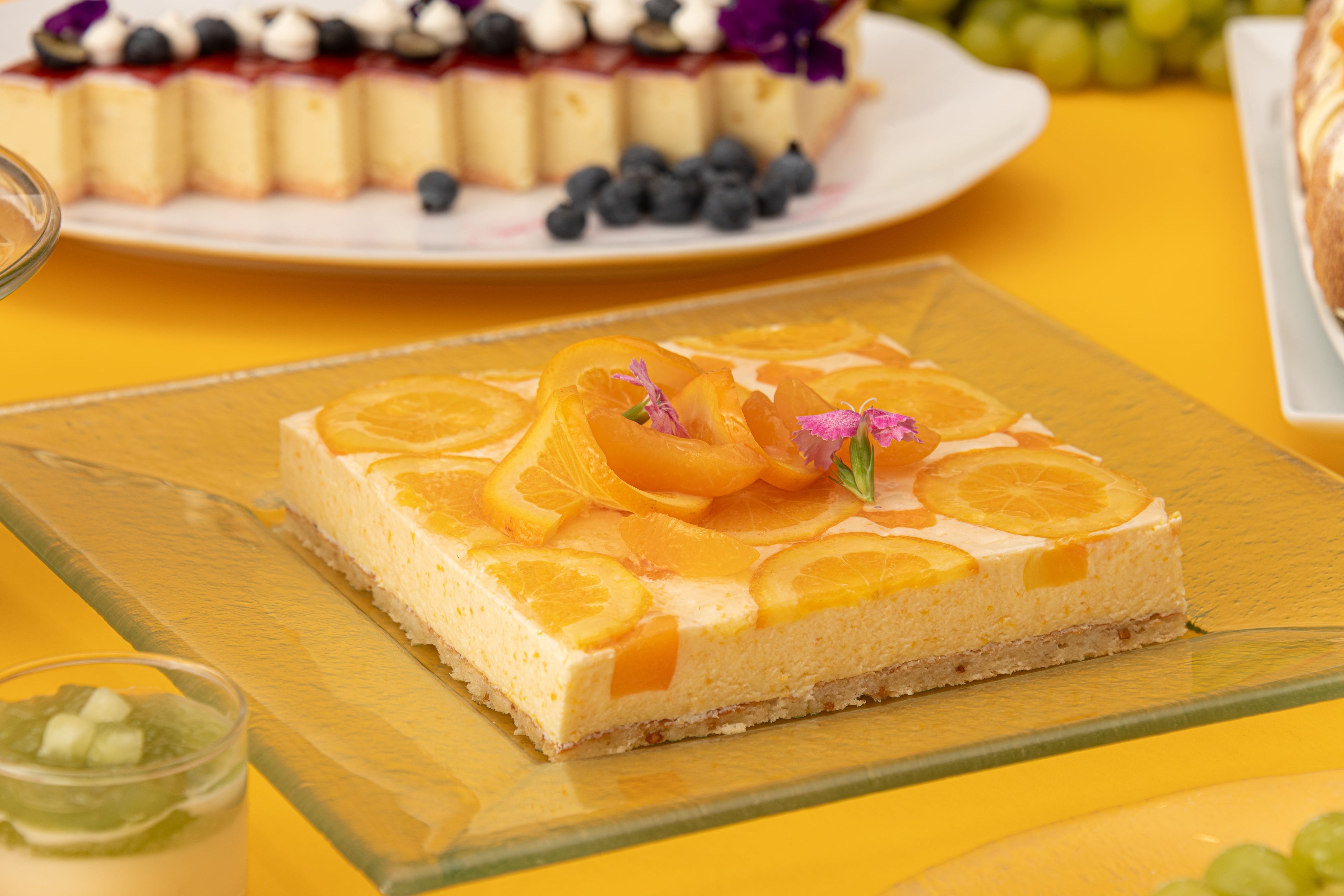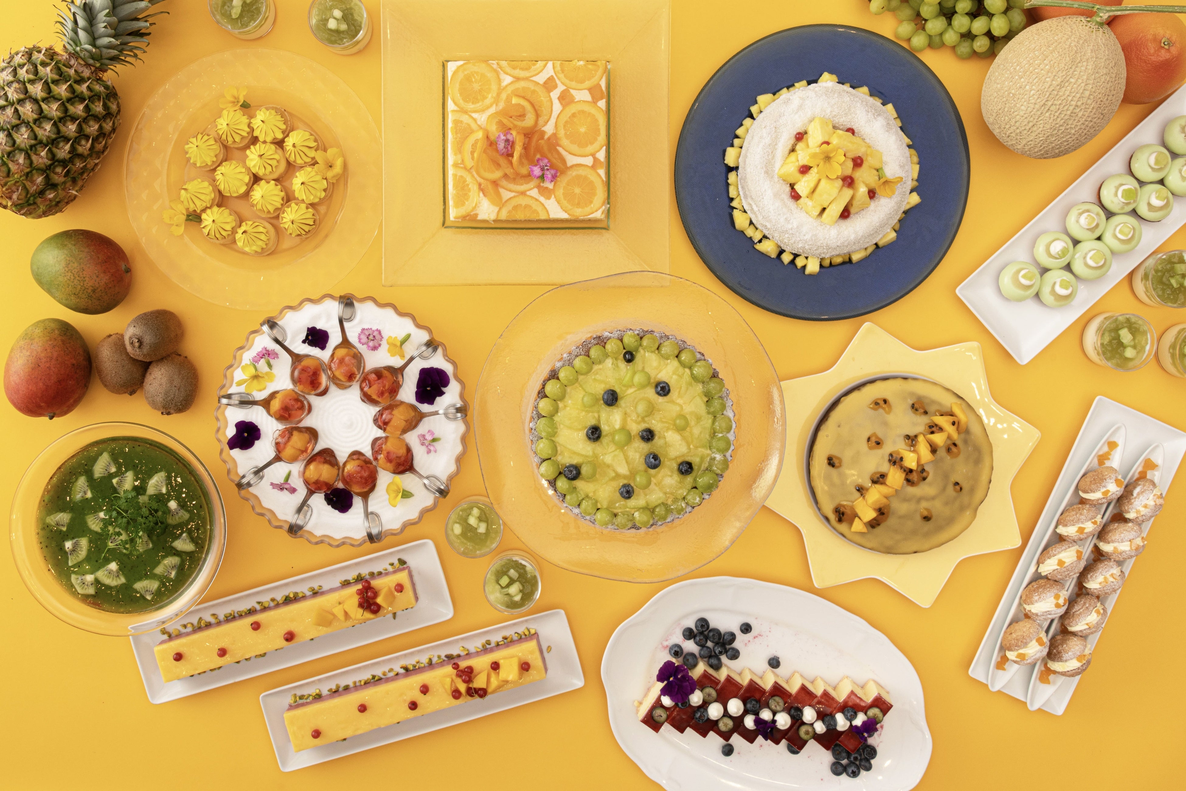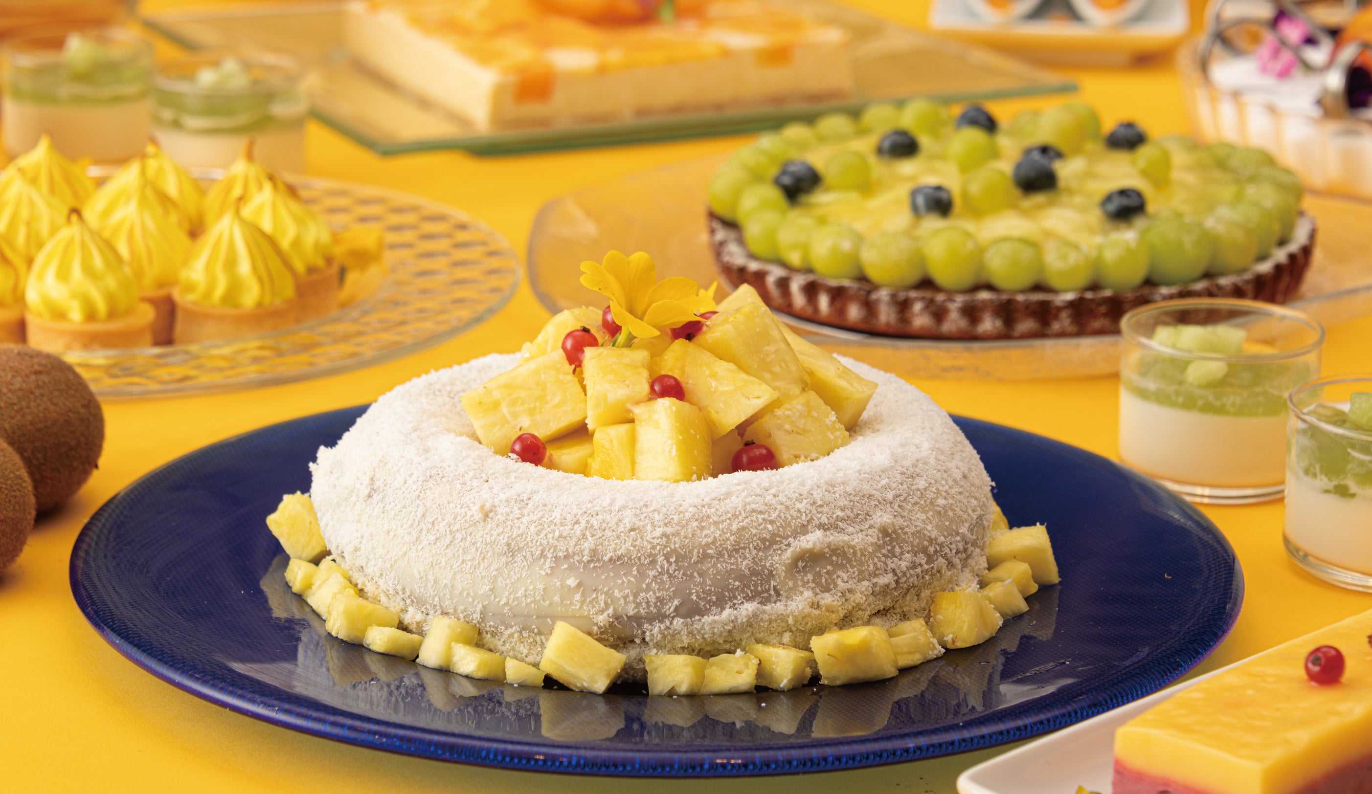 レモンタルト/トロピカルケーキ/オレンジとアプリコットのムース/マンゴーとベリーのムース/フルーツゼリー/メロンとぶどうのタルト/メロンとマスカルポーネのケーキ/メロンのベリーヌ/パイナップルとココナッツのケーキ/フルーツダックワーズ/ブルーベリーチーズケーキ/キウイのスープなど