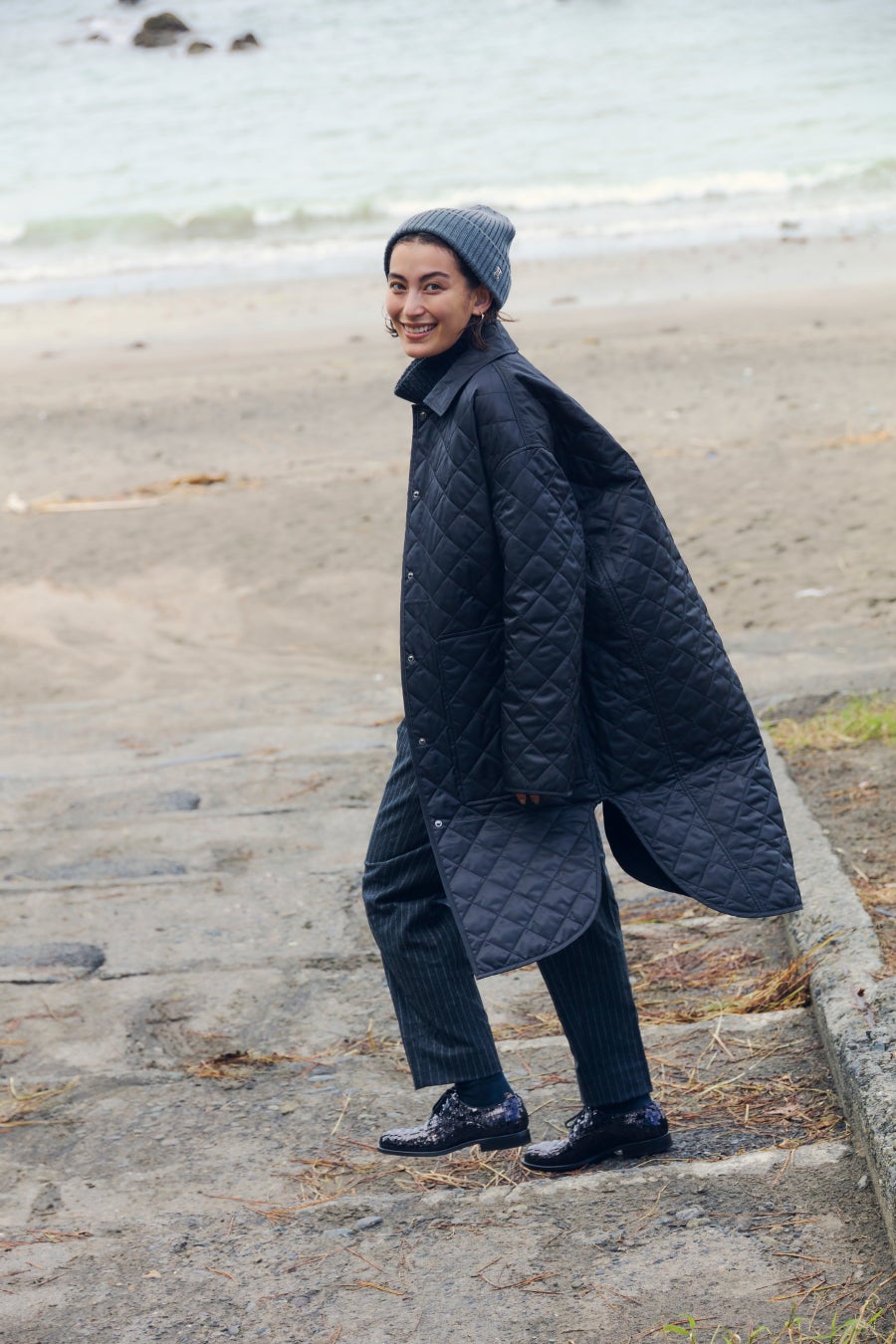 右)ウォーターレペレント ロング キルティングコート \38,000 イタリアン メリノブレンド クロップドセーター \28,000 ハイライズ プリーツ フランネルパンツ \21,000