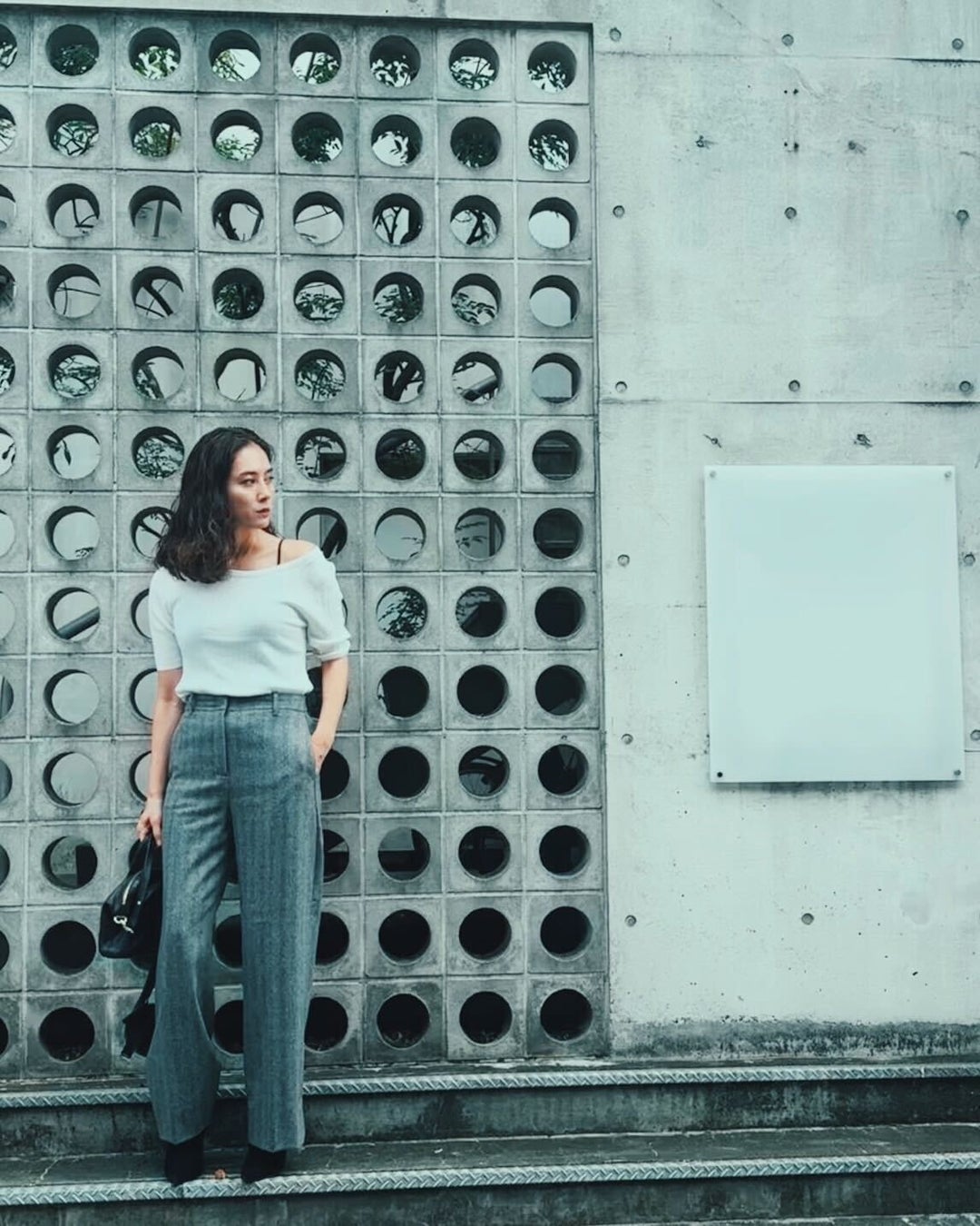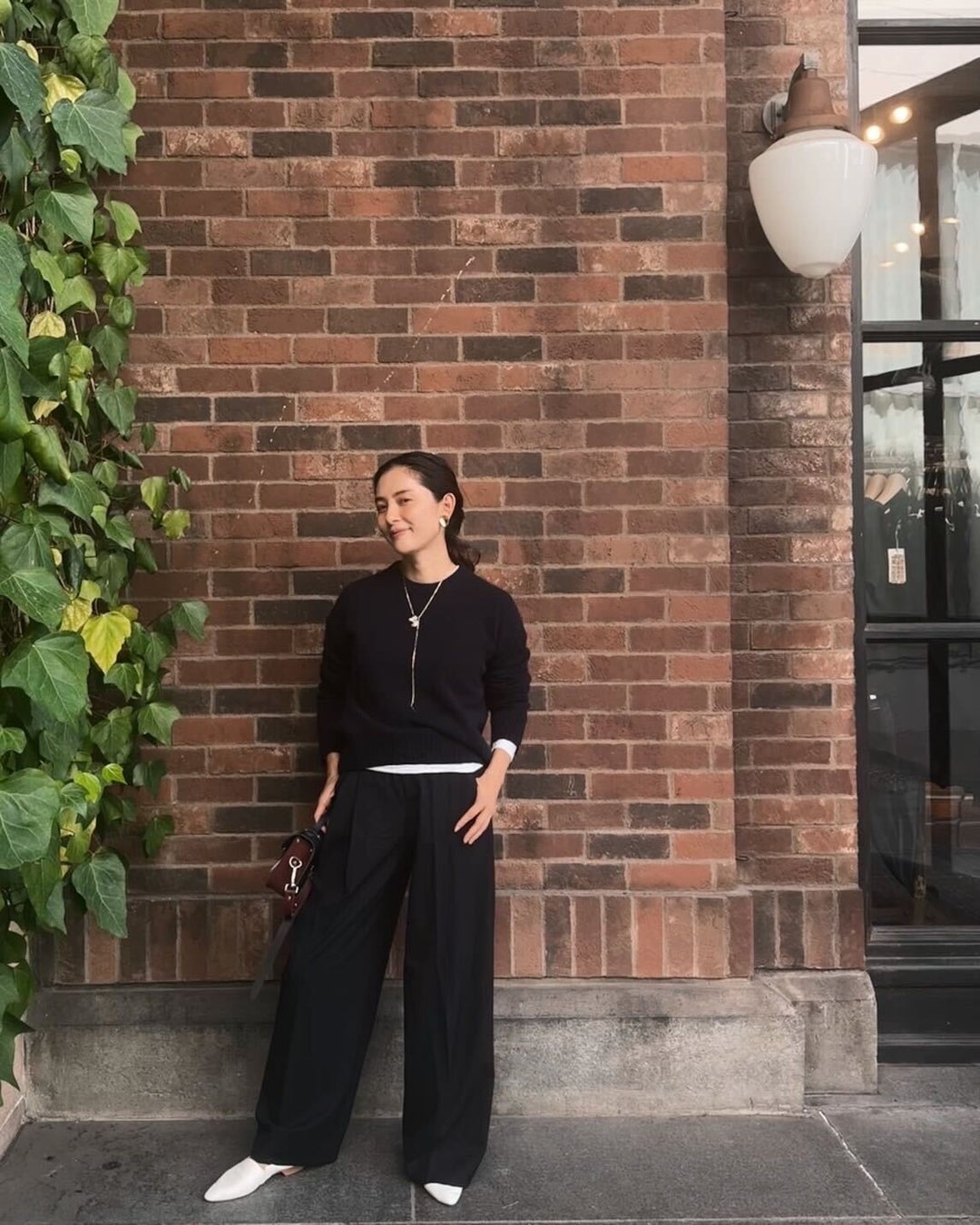 ベイカー恵利沙さんは、ネイビーのメリノウールリブニットに、ピンタッグを施したデニムを合わせて秋の大人カジュアルスタイルに。白澤貴子さんは、半袖のメリノセーターにヘリンボーン柄のパンツを合わせたマニッシュな秋スタイル。菅原ありあさんは、クラシックなリブ編みのメリノウールニットポロと、イタリアンウールのワイドパンツを組み合わせた秋のリラックススタイルを披露。Karanさんはメリノウールのノースリーブニットに、エレガントなツータックデザインのワイドパンツと合わせた抜け感のあるエフォートレスタイルが魅力です。