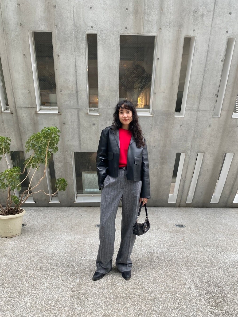 右)ボンデッドレザージャケット \120,000/ メリノ クルーネック クロップドセーター \18,000/ ハイライズ モダン ストレート ヘリンボーンパンツ \21,000