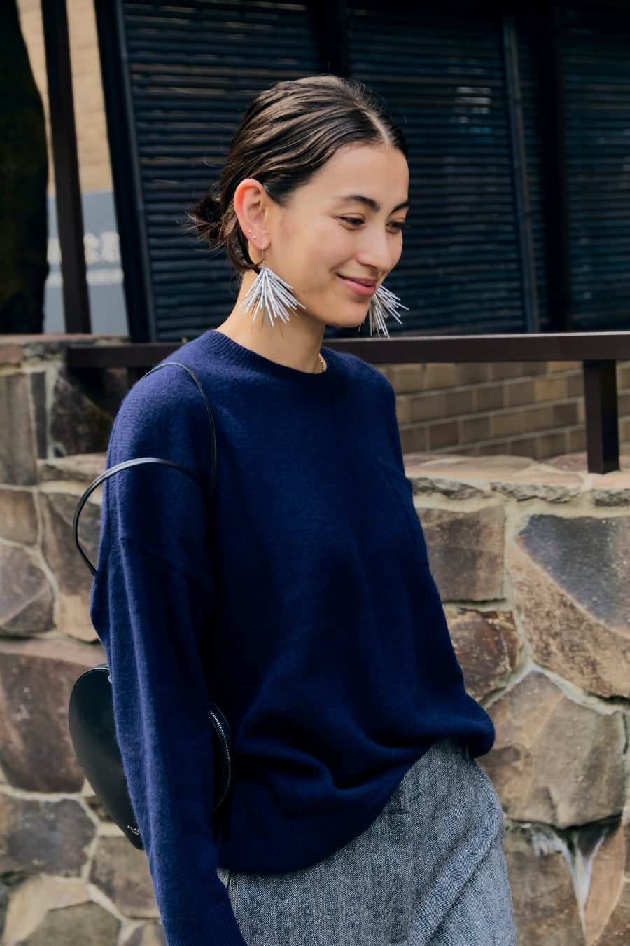 中)オーバーサイズ ミッドウェイト カシミヤ クルーネックセーター \24,000/ ワイドレッグ イタリアンウール パンツ \24,000