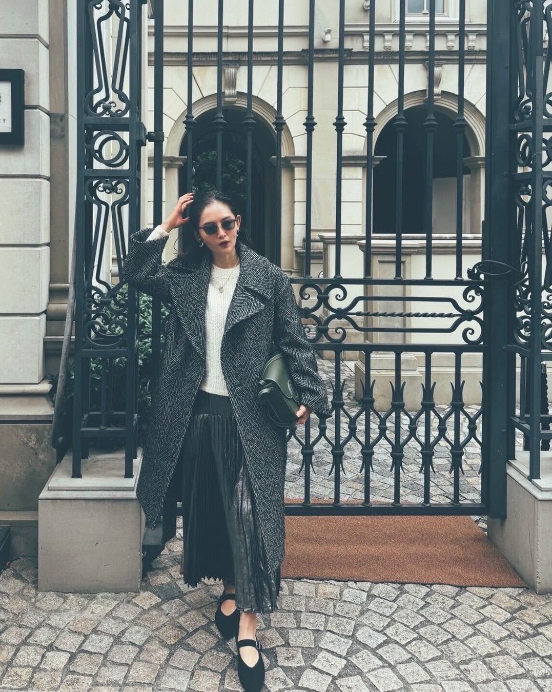 右)オーバーサイズ ヘリンボーン カーコート \78,000/ メリノブレンド クルーネックセーター \16,000/ プリーツ ドロップウエスト マキシドレス \16,000