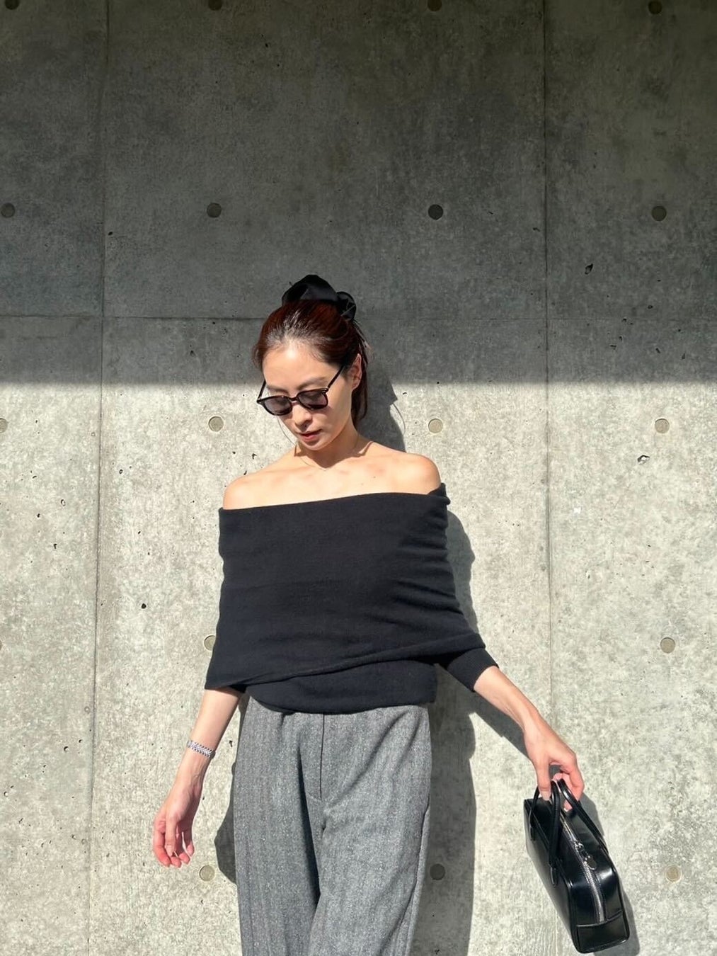 中)ライトウェイト カシミヤ オフショルダー セーター \28,000/ ハイライズ モダン ストレート ヘリンボーンパンツ \21,000
