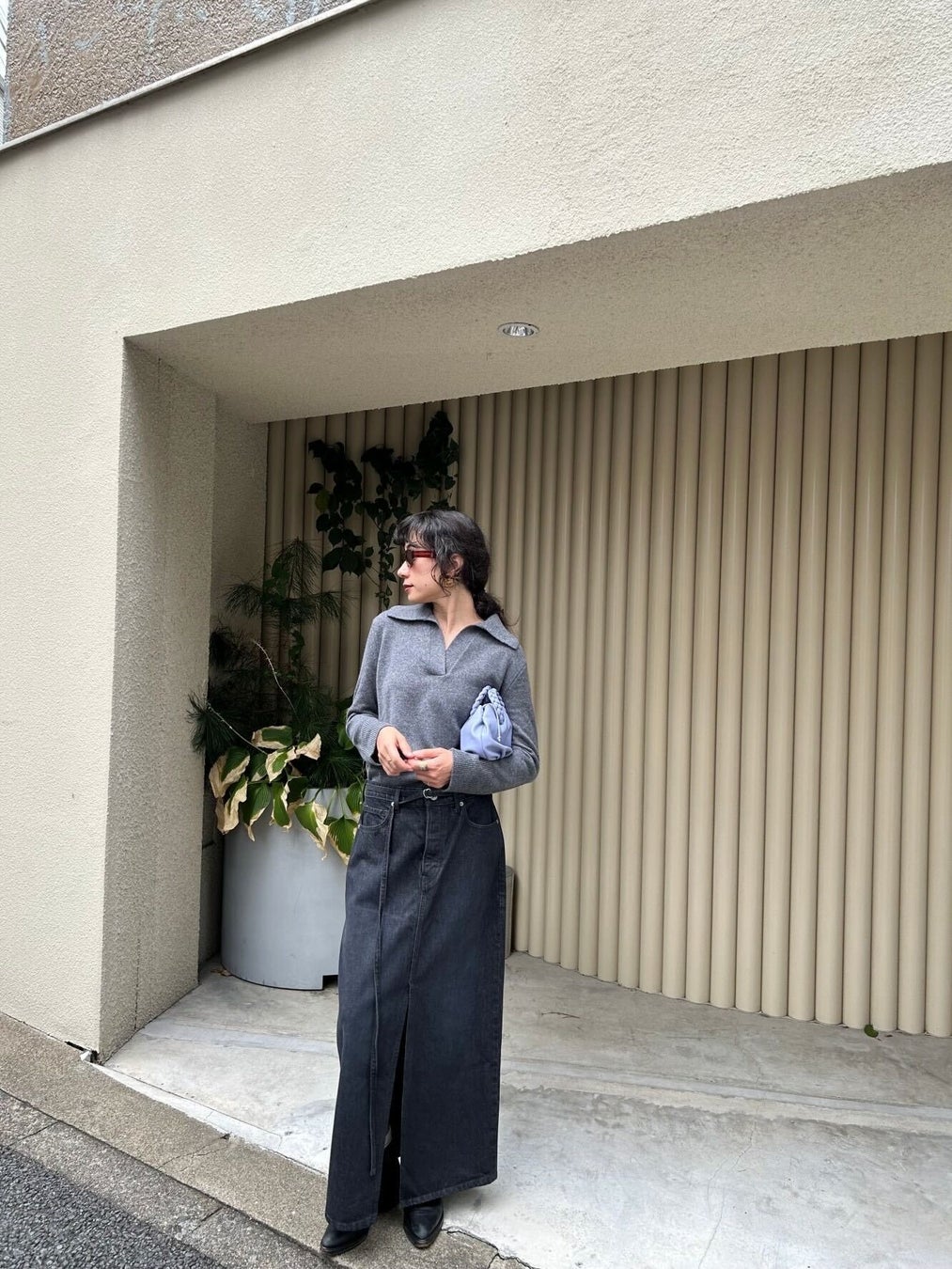 中)カシミヤ ニットポロ \28,000/ デニム マキシスカート \16,000