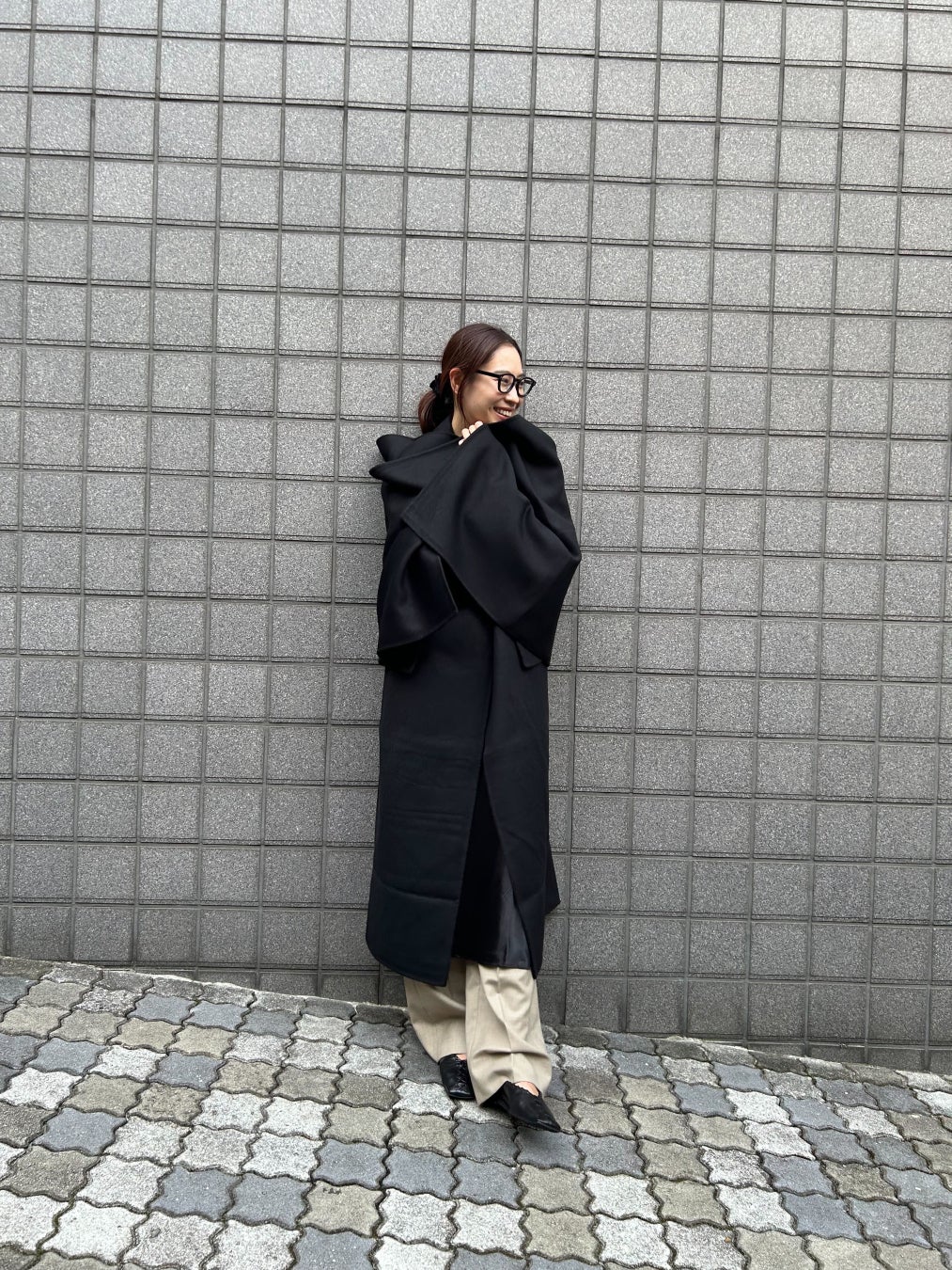 右)オーバーサイズ ダブルフェイス スカーフコート \57,000/ バイアスカット サテン ミディドレス \22,000