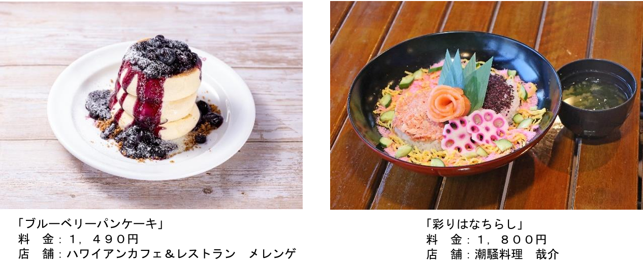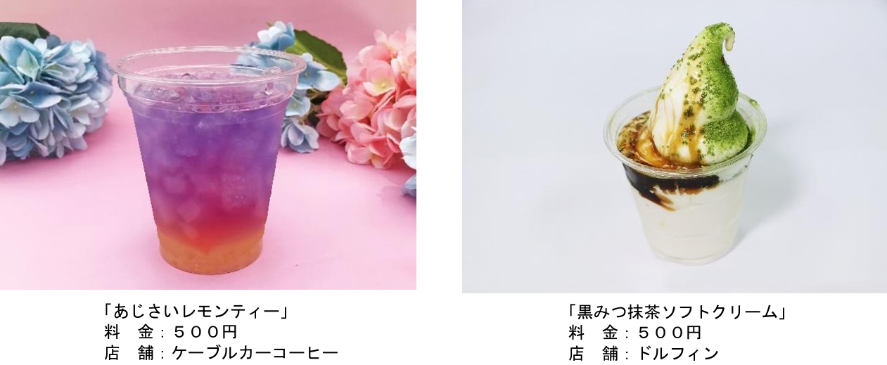 島内のレストランや軽飲食店舗では、花のフードメニューをご用意いたします。見た目も華やかなフードやスイーツ、あじさいカラーのドリンクなど、味覚だけでなく視覚でも初夏の彩りをお楽しみいただけます。
