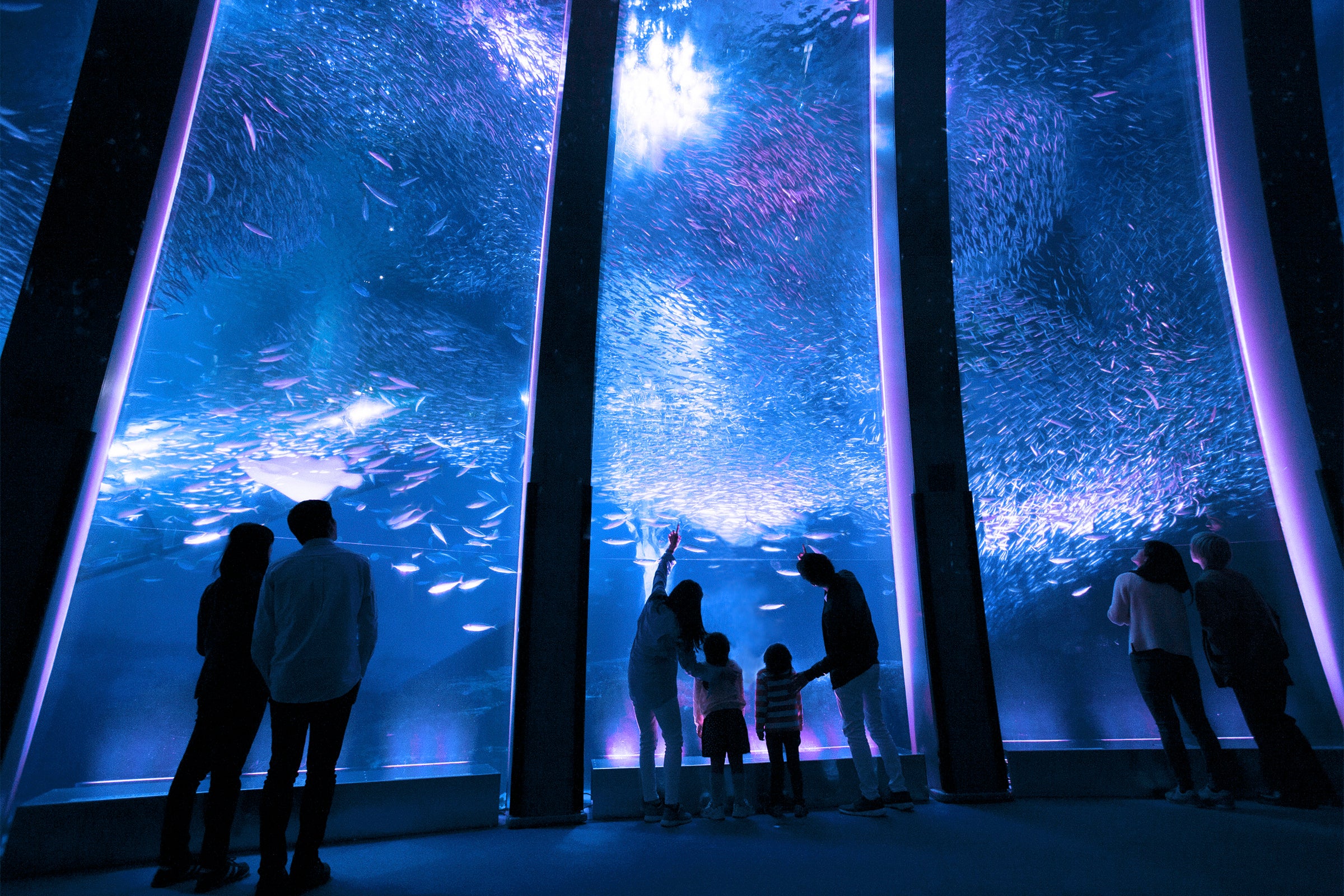 水族館「アクアミュージアム」にある高さ8m、水量1,500トンの大水槽「大海原に生きる群れと輝きの魚たち」では、国内最多飼育数5万尾のイワシが音楽や照明に合わせ乱舞する「スーパーイワシイリュージョン」を毎日開催しております。期間中の「スーパーイワシイリュージョン」では、大水槽全体が梅雨やあじさいなどをイメージした青色などの淡いライティングとなり、降りそそぐ雨のようにイワシがキラキラと輝くパフォーマンスをお楽しみいただけます。